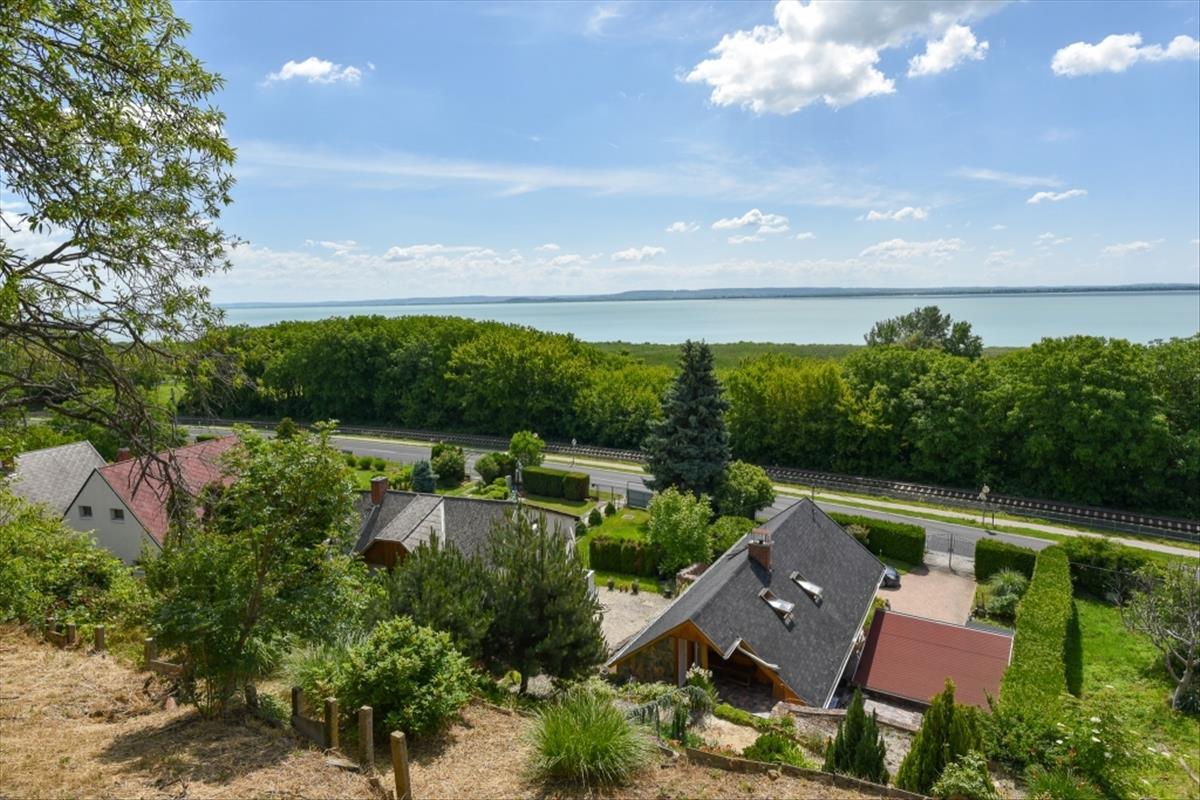 A telek első része sík és térkövezett, így akár 5 gépjármű is elfér az udvarban, az épület mögötti telekrészlet meredeken emelkedik, a kőlépcsőkön keresztül felérhetünk a telek kilátószerű pontjára, ahonnan bámulatos a panoráma a balatonra. (A házból, a telek első részéről a tó nem látható)