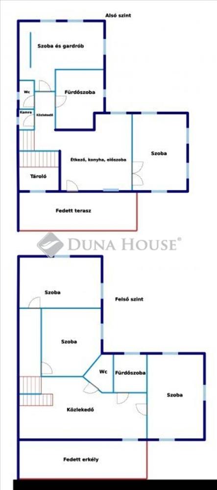 Az ingatlan alsó szintje 119 m2, amely 2 szoba, konyha+étkező, fürdőszoba, wc, kamra, előtér helyiségekből áll.