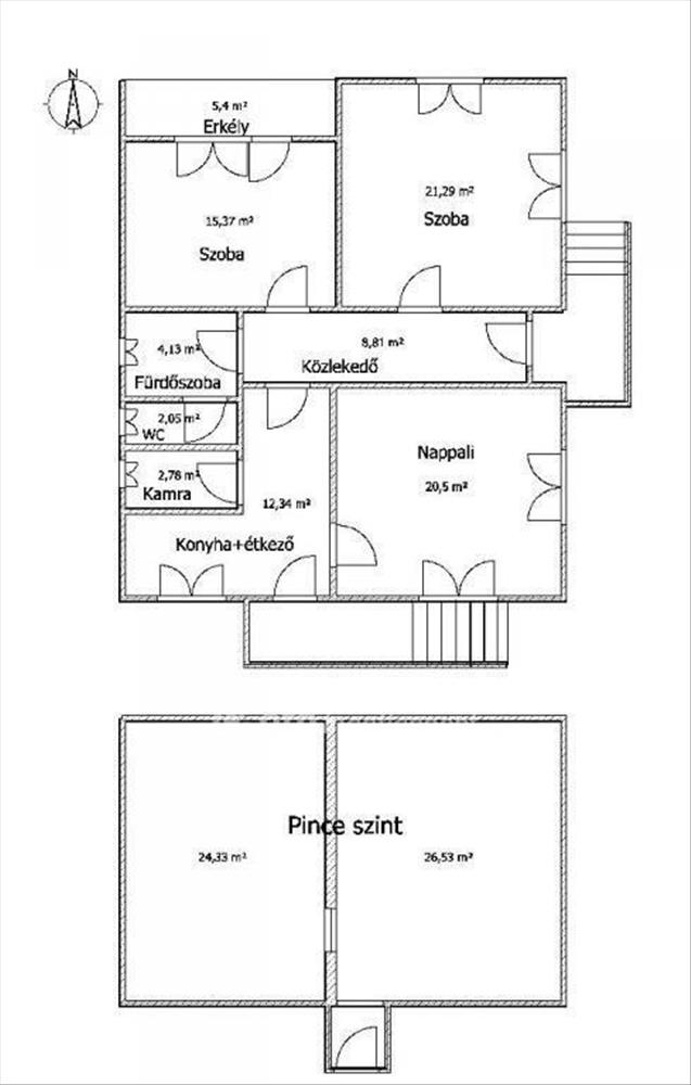 Erős jó szerkezetű épületben 3 szoba, konyha+étkező, fürdőszoba, külön wc, közlekedő és kamra kapott helyet.
