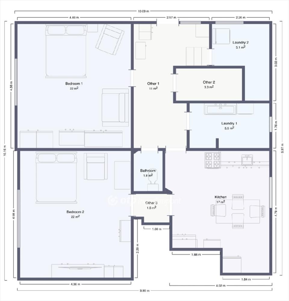 A lakás elrendezése átgondolt, tágas és jól élhető tereket biztosít. a két, egyenként 22 m2-es, laminált parkettával burkolt szoba világos, nyugodt életteret kínál, ideális pihenéshez, családi együttlétekhez vagy akár otthoni munkavégzéshez. a 17 m2-es konyha praktikus kialakításának köszönhetően kényelmesen használható, elegendő helyet biztosít a mindennapi főzéshez és étkezéshez. a lakás közlekedői (11 m2 és 15 m2) tágasak és jól szervezettek, biztosítva a helyiségek kényelmes megközelítését. Az 5, 1 m2-es félszoba kiválóan alkalmas dolgozószobának, gardróbnak vagy vendégszobának. a fürdőszoba és wc egy helyiségben kapott helyet (5, 5 m2), emellett külön mellékhelyiség is rendelkezésre áll (1, 8 m2), ami a mindennapi komfortot jelentősen növeli. a 2 m2-es erkély kellemes lehetőséget kínál egy nyugodt reggeli kávéhoz, míg a további közlekedő terek funkcionálisan teszik teljessé a lakás használhatóságát.