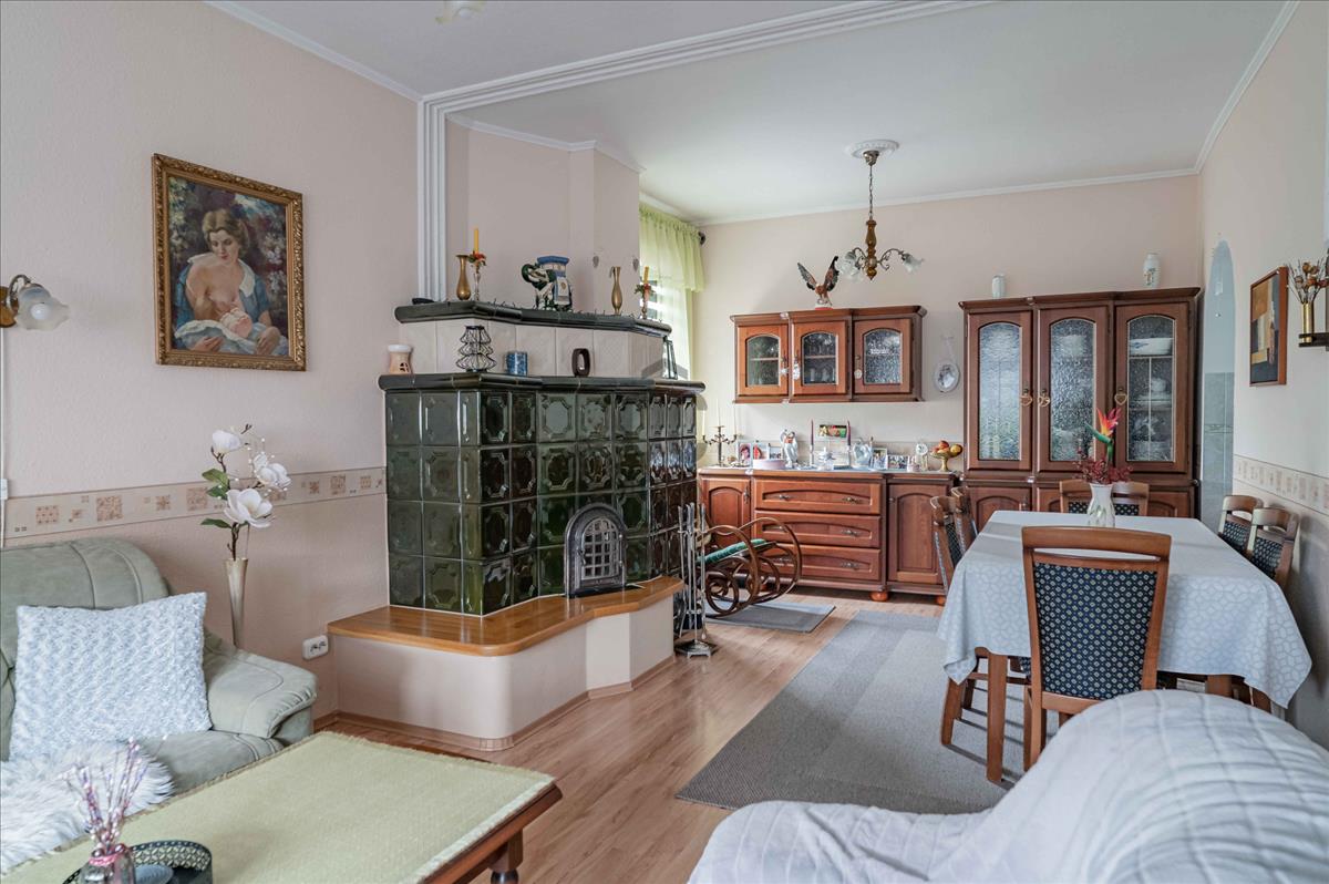 Nappali + étkező: világos, jól tagolt tér, gyönyörű cserépkályhával