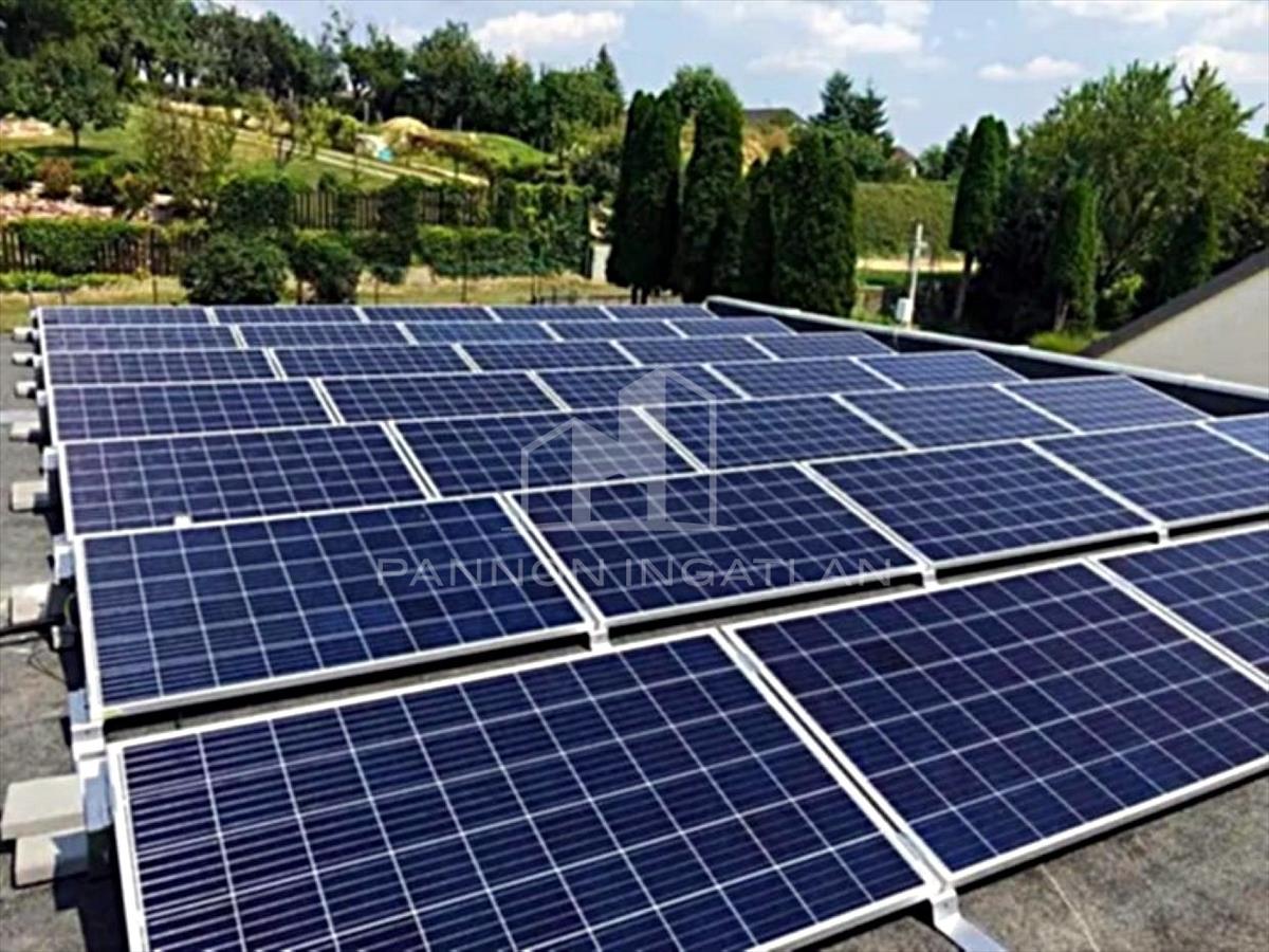 A lapos tetőn elhelyezett 12 kW-os napelemek nemcsak a ház fűtését és villamosenergia-ellátását biztosítják, hanem plusz energiát is termelnek, így a tulajdonos akár bevételre is szert tehet.