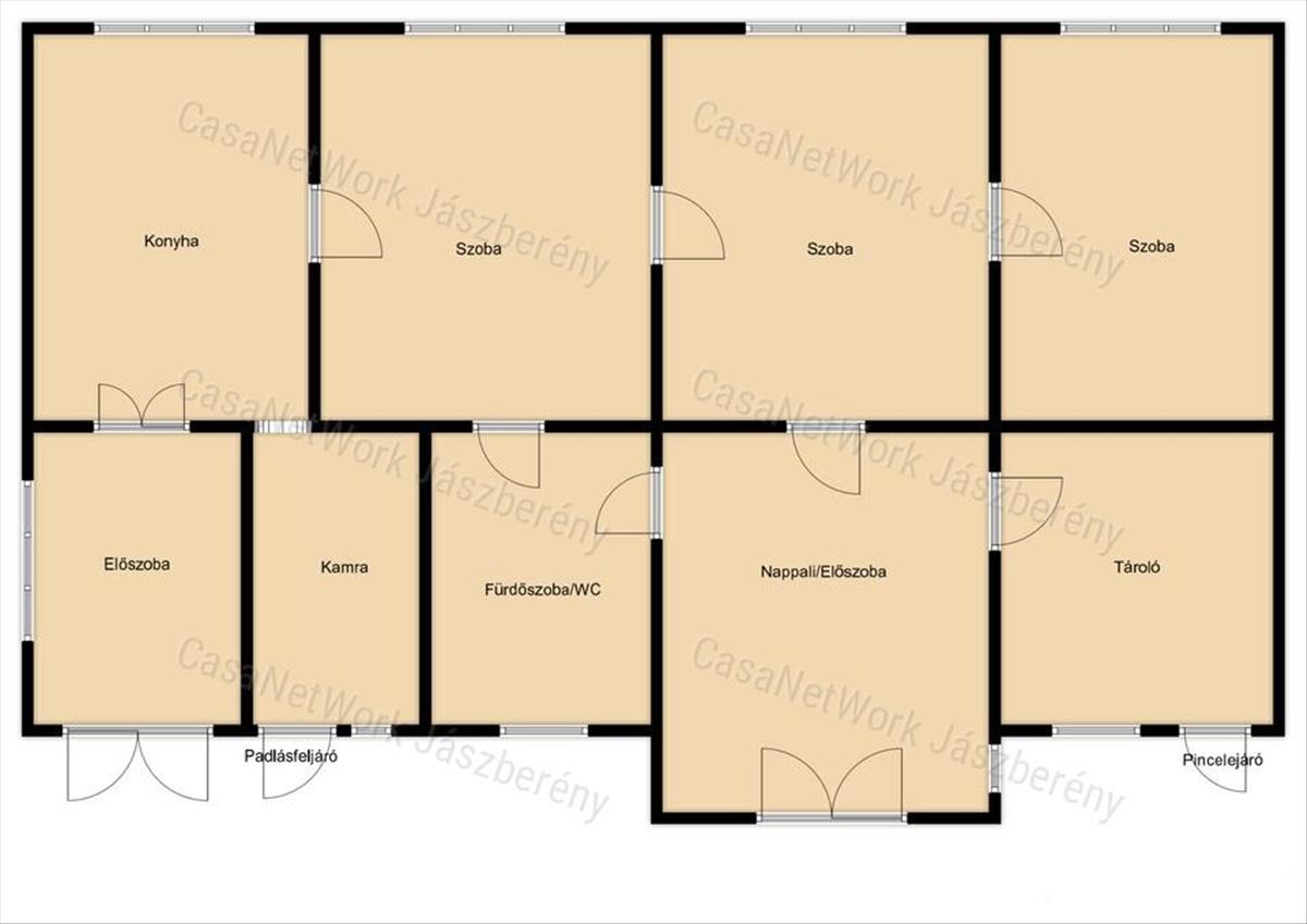 - rendelkezésre álló helyiségek: előszoba, előtér, konyha, fürdőszoba/WC,  nappali, 3 db szoba, tároló és kamra,