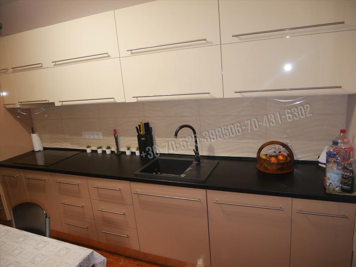 A beépített magasfényű konyhaszekrény a benne lévő gépesítéssel a vételár részét képezik.