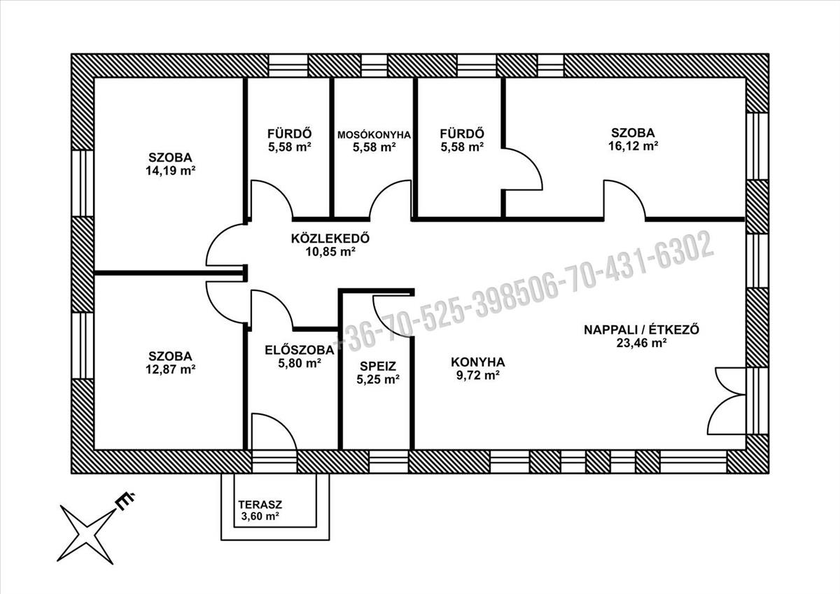 A belső térben: 3 szoba, előszoba, amerikai konyhás nappali, 2 fürdőszoba, spejz, háztartási helyiség került kialakításra. a nappaliból terasz ajtó nyílik a hátsókert felé.