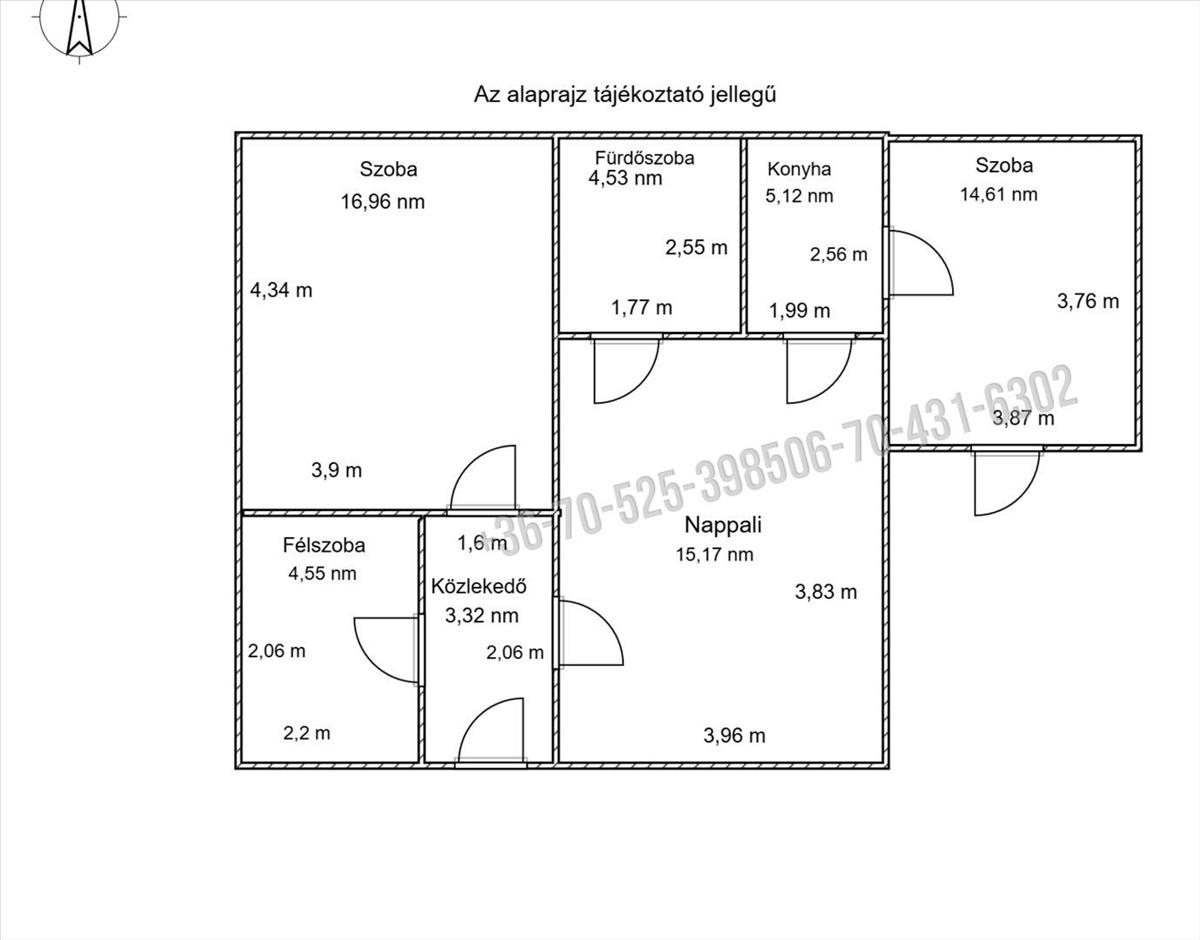 A belső térben: 3 szoba, félszoba, konyha, étkező, kádas fürdőszoba és közlekedő került kialakításra.