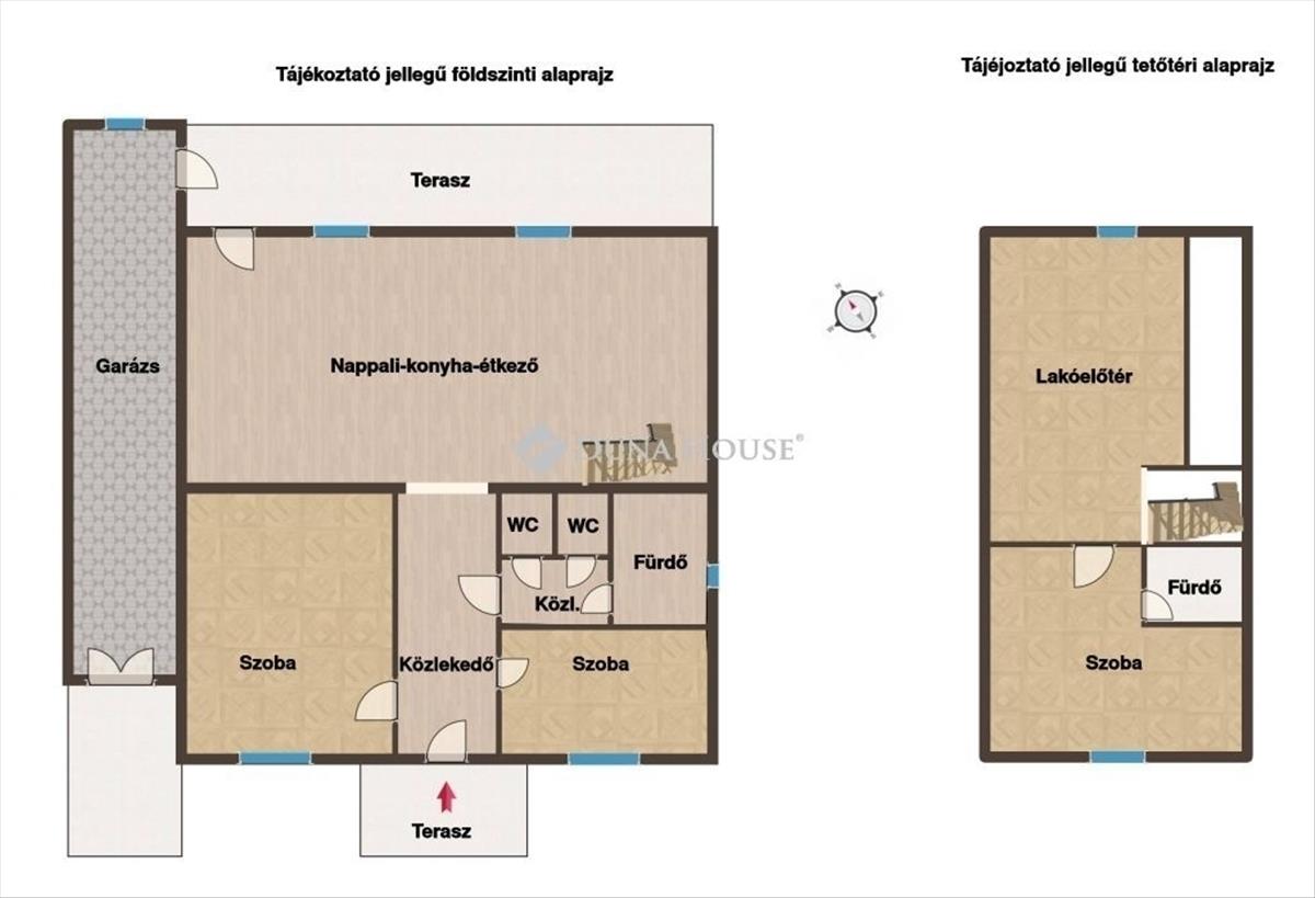 A földszinten két hálószoba, egy tágas amerikai konyhás nappali, közlekedő, fürdő és wc helyiségek lettek kialakítva. a nappaliból nyílik a 21nm nagyságú fedett terasz. a tetőtérben egy lakóelőtér, hálószoba valamint egy fürdő helyiség található, de akár még egy szoba is kialakítható.