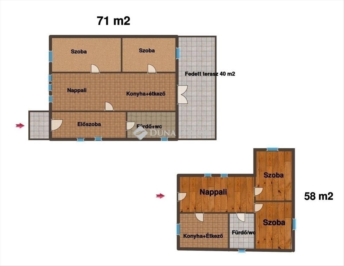 A nagyobbik ház 71 m² alapterületű, amelyben két szoba, nappali, konyha, étkező, közlekedő, valamint fürdőszoba WC-vel került kialakításra. Az ingatlanhoz egy tágas, 40 m²-es fedett terasz is tartozik, amely kiváló helyszíne lehet a pihenésnek vagy családi összejöveteleknek. Az épület beton alapra épült, vegyes falazattal, masszív szerkezettel, betoncserép fedéssel. Az elmúlt öt év során teljes körű műszaki felújításon esett át: megtörtént a víz-, villany- és csatornahálózat cseréje, új burkolatok kerültek minden helyiségbe, valamint korszerű műanyag nyílászárók lettek beépítve. a belső tér igényesen kialakított, prémium minőségű hidegburkolatokkal és látványos falikő díszítésekkel, amelyek a teraszon, a nappaliban, a tv falnál és a kandalló mögött is megjelennek.