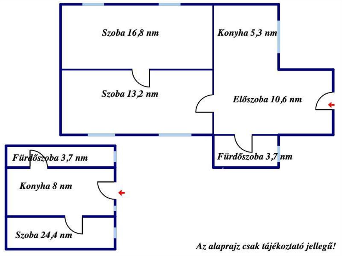 A telken két külön bejáratú ház található, melyeket egy tető köt össze. Az egyik épületben két szoba, konyha és fürdőszoba, míg a másikban konyha, fürdő és egy szoba vagy tároló kapott helyet. a fűtést jelenleg kályha biztosítja, de a kialakítás rugalmasan alakítható.