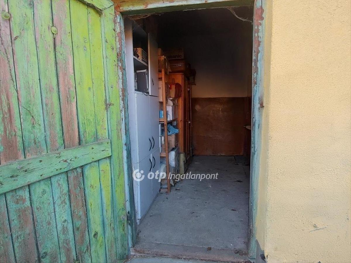 A melléképület nagyobb 70 m2-nél, de ez az a terület, ami szintén téglából épült, itt beton kefnis födém van. Itt egy szoba, kamra, egy nagyméretű gazdasági tároló, ahová egy nagy teherautó is beállhat, illetve egy másik tároló, még egy kisebb garázs, és fatároló helyiségek és kerti Wc is van. Ebben a házban csak villany van.