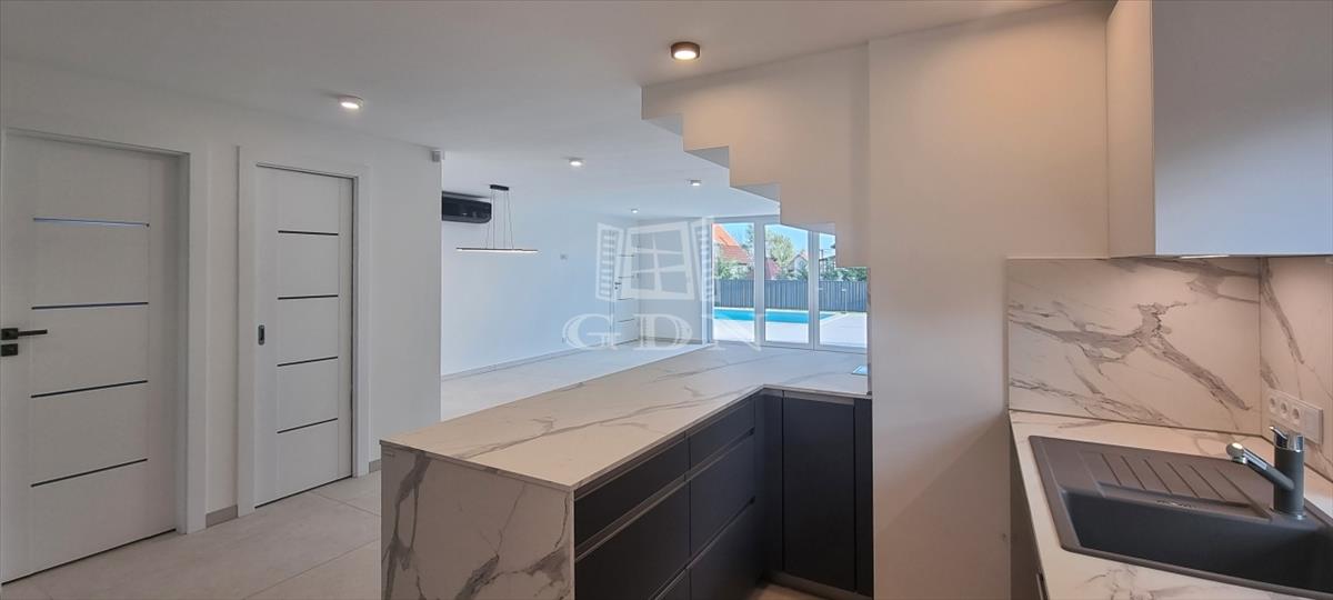 Ez az otthon nem csupán egy ingatlan — életstílus. a belső terek modern, prémium anyagokból készültek: olasz 60×120 cm padlólapok, Venato Bianco slimline munkalap, szálcsiszolt rozsdamentes acél élvédők és biztonsági üvegkorlátok. a fürdőszobák okostükörrel, digitális hőmérséklet-kijelzős csaptelepekkel és padlófűtéssel felszereltek. a villa minden tekintetben a legmagasabb igényeket is kielégíti.