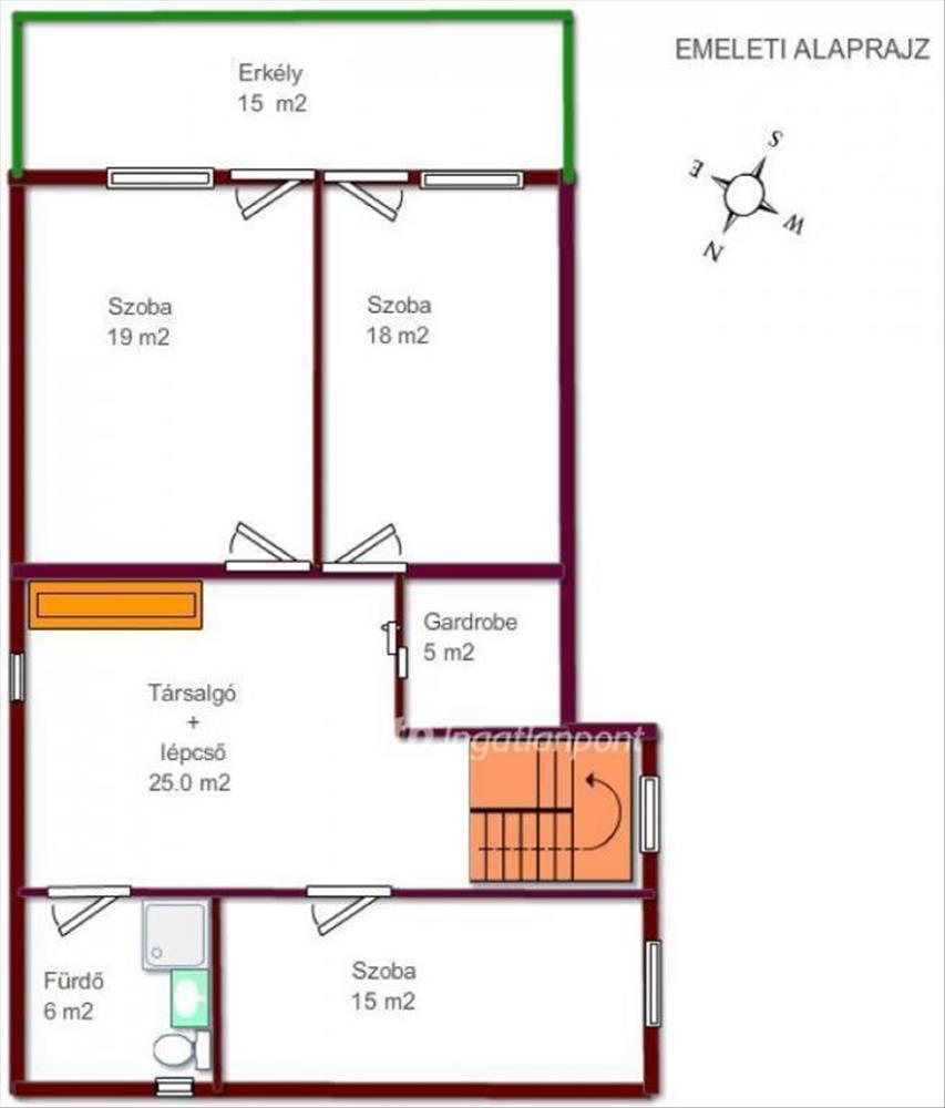 Az emeleten 3 hálószoba, 1 fürdőszoba, 1 gardrób és 1 hall található, a 2 nagyobb szobából lehet kijutni az erkélyre, ahonnan részlegesen látni a Balatont, illetve a hallból nyílik a padlásfeljáró.