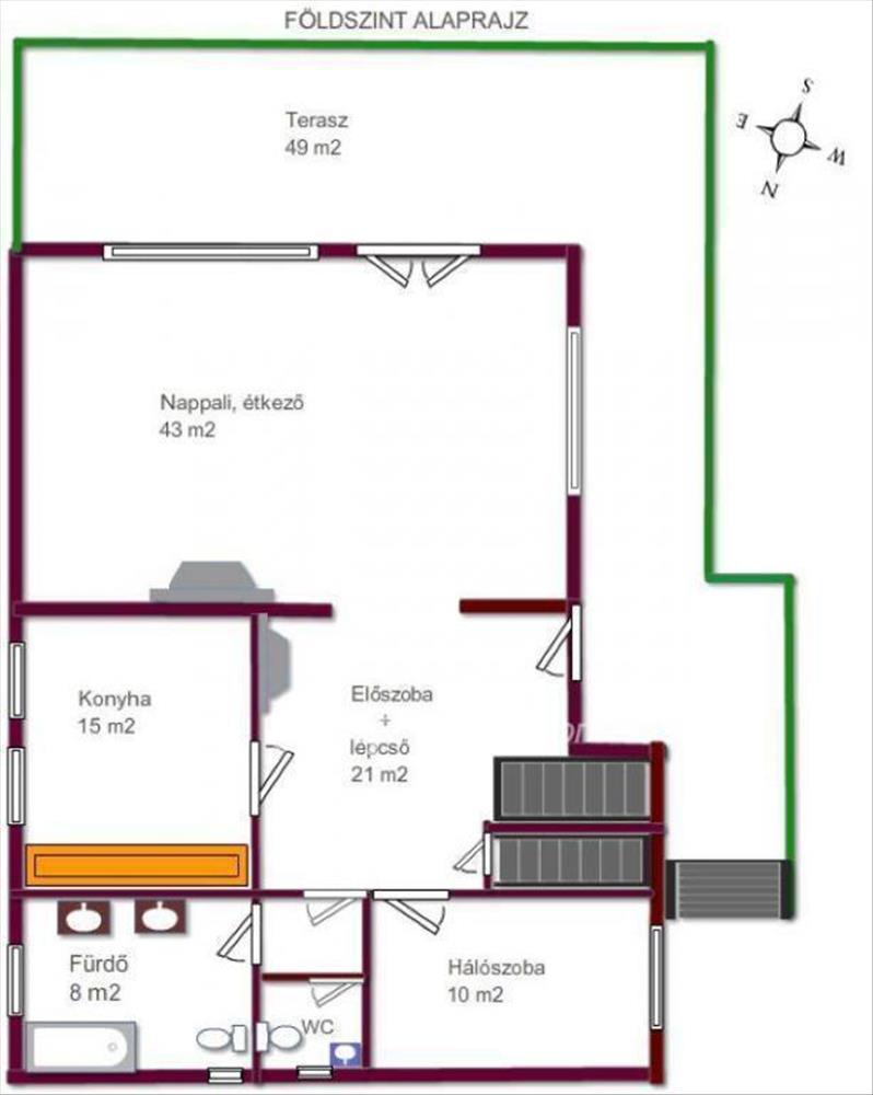 A földszinten 1 hálószoba, 1 konyha-étkező, 1 fürdőszoba, 1 wc, 1 nagy nappali-étkező és egy előszoba található, az előszobából nyílik a pince lejáró, illetve innen jutunk a kényelmes fa lépcsőn az emeletre. a terasz L alakban helyezkedik el a ház kert felőli és bejárat felőli oldalán, az oldalsó részen árkádos kialakítású, a kert felőli oldalon kinyitható árnyékolóval felszerelt. a garázs a ház bal oldalához került hozzáépítésre, kényelmes nagyságú, hátsó részében galériaszerű tárolórészt alakítottak ki.