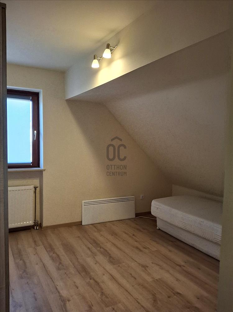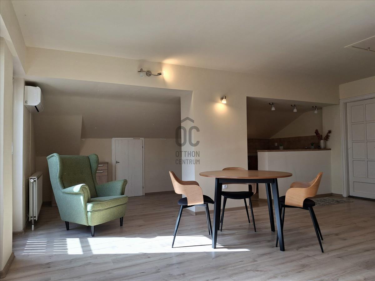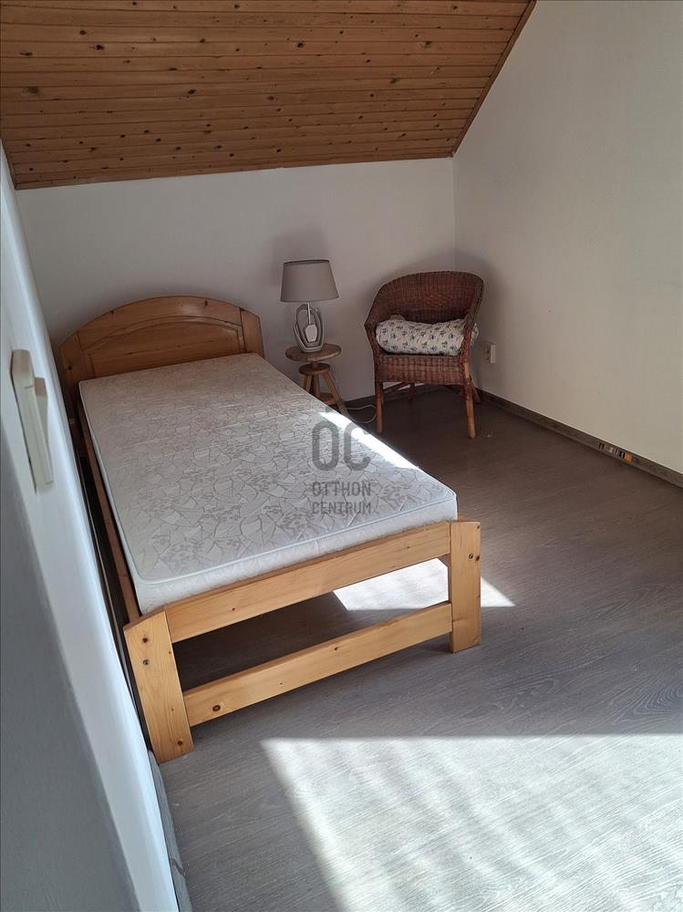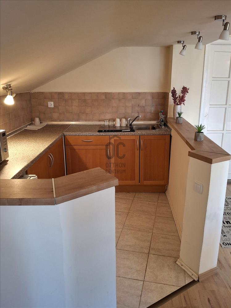 A tetőtéri lakrész elosztása: nappali- konyha, kádas fürdőszoba és hálószoba.