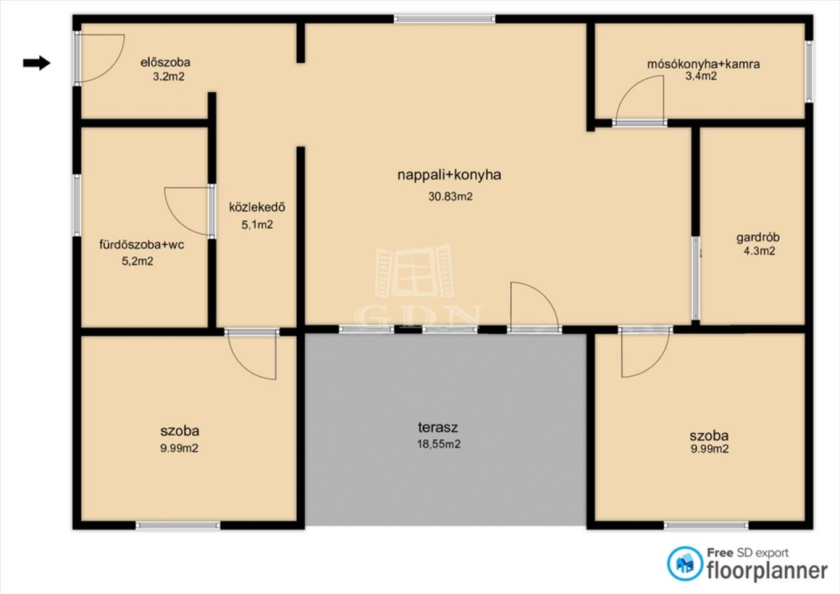 - Tágas nappali–étkező–konyha egybenyíló térrel