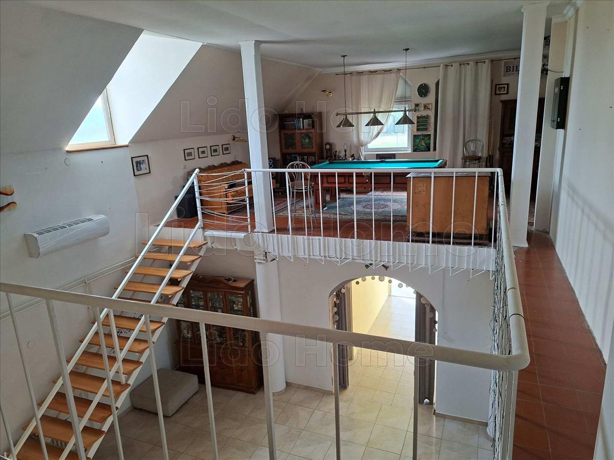 - tetőtér: nappali, hálószoba, konyha, fürdőszoba (befejezésre vár), külön wc, 2 hálószoba, 2 fürdőszoba zuhanyzóval és WC-vel, kamra, galéria, gardrób szoba, az utcafronton exkluzív berendezésű billiárd szalon