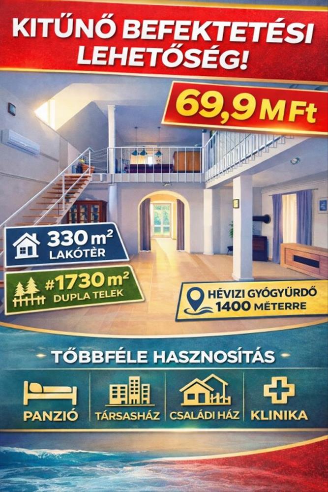 Alsópáhokon, a Hévízi tófürdő bejáratától 1. 300 Méterre, 1. 740 m2-es telken, 330 m2-es, 9 szobás vendégház eladó.
