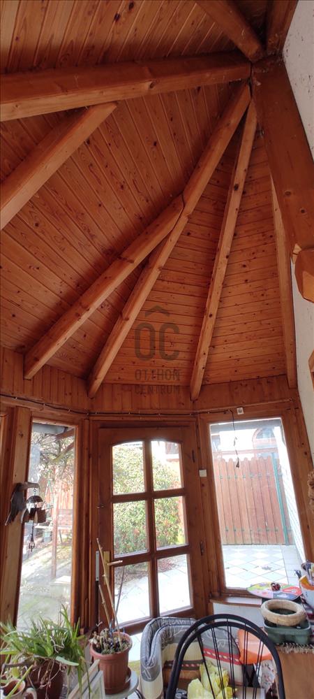 A bejárati szélfogó és a nappali mennyezetének igényes faborítása a tulajdonos keze munkáját dicséri.