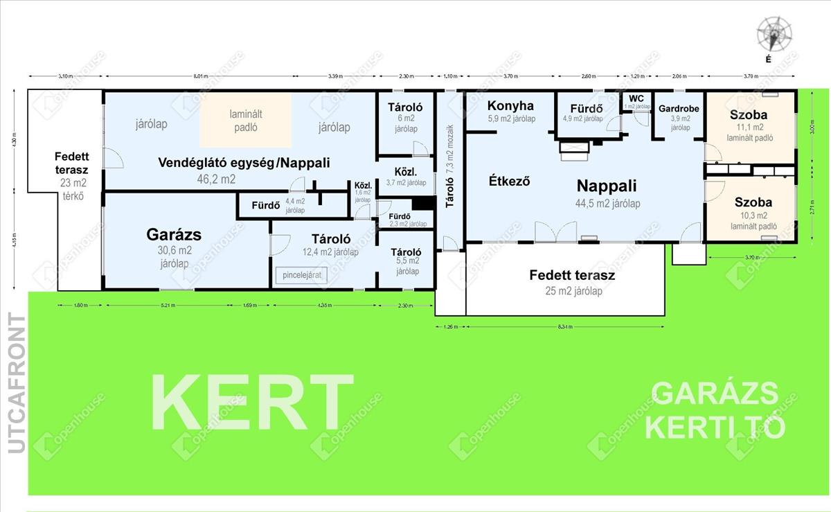 - tágas 25 m2-es belső terasz járólappal burkolva és egy térkövezett szintén fedett utcafronti 23 m2-es utcafronti terasz szabadtéri vendéglátási lehetőségre