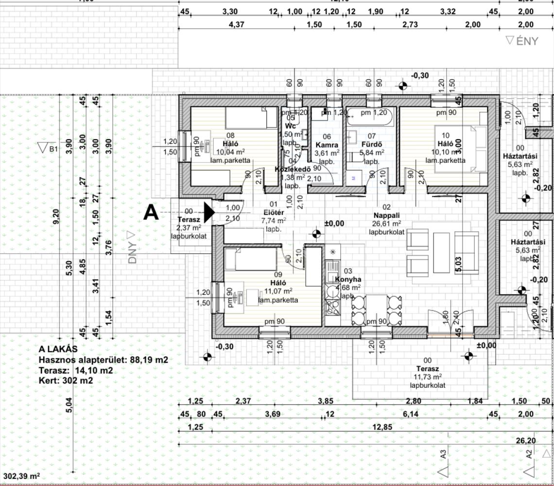 Elrendezés és helyiségek méretei: előszoba: 5, 64 m², nappali: 29, 24 m², konyha: 5, 30 m², szoba 1: 12, 28 m², szoba 2: 10, 04 m² szoba 3: 9, 66 m², fürdőszoba: 5, 82 m², külön wc: 1, 50 m², kamra: 2, 96 m²,
