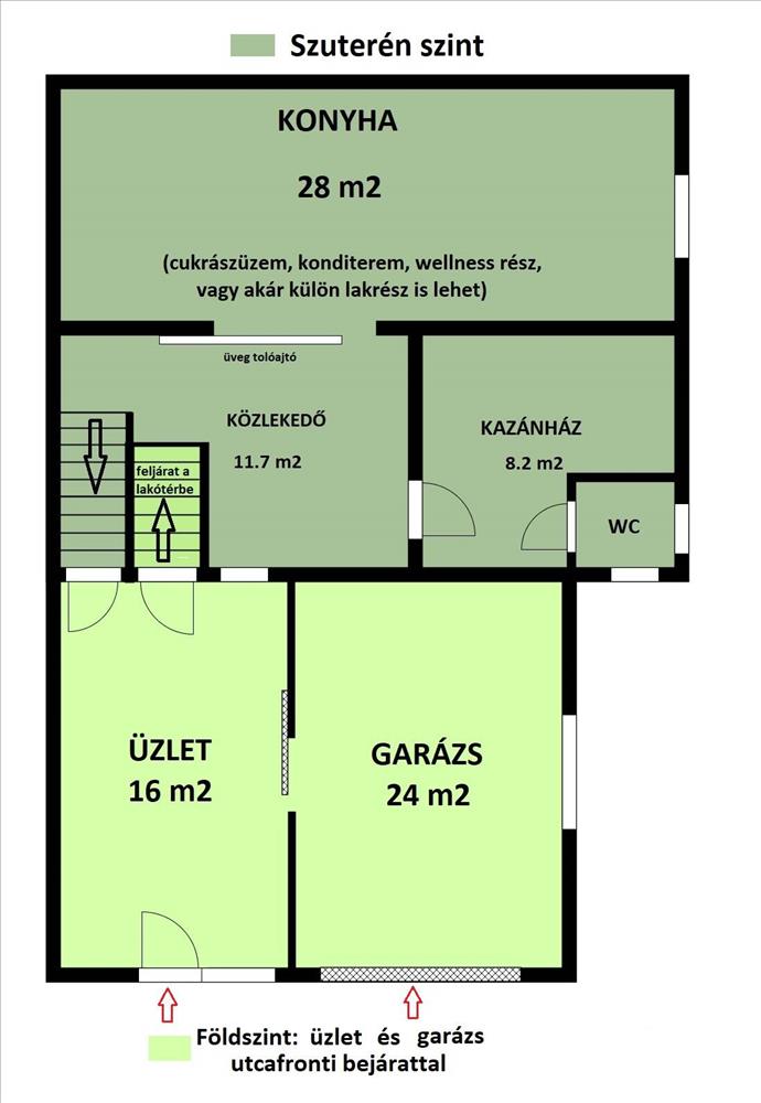 • Lakótérből lépcsőn át juthat le a garázs szintre (40m2), ahol a garázs, valamint egy hangulatos kis üzlethelyiség található, utcafronti bejárattal. Az üzletből pár lépcsőfok, s máris a „meglepetés” szuterén szintre jutunk.