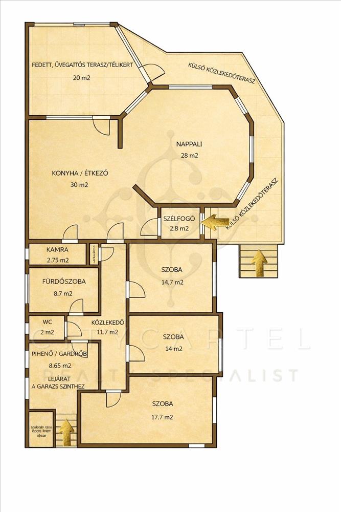720 nm telek | 206 nm összterület | 140 nm lakótér | 40 nm garázsszint | 50 nm szuterén | 20 nm fedett, üvegezett terasz | 3 szoba | 5 klíma | padlófűtés | beépíthető tetőtér