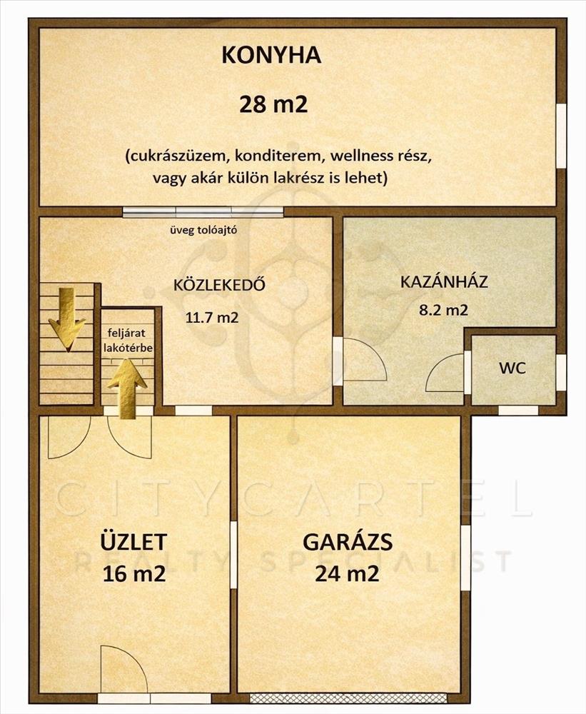 A lakótérből belső lépcső vezet a 40 nm-es garázsszintre, ahol a garázs mellett egy külön kialakított, hangulatos üzlethelyiség is található. Ez a rész ideális lehet irodának, bemutatóteremnek vagy otthonról működtetett vállalkozás számára.
