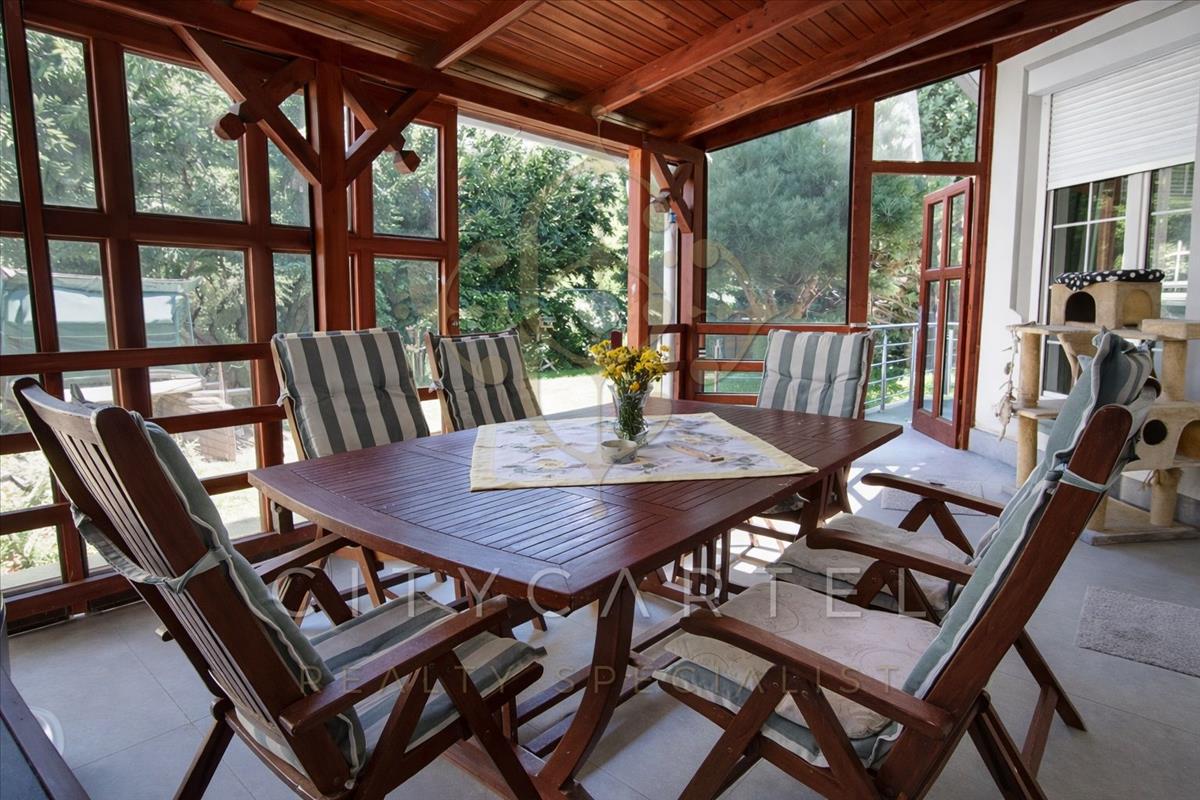 A konyhából közvetlen kijárat nyílik a 20 nm-es fedett, üvegezett teraszra, amely tolóajtóval kapcsolódik a kerthez. Ez a tér valódi élettérként funkcionál: reggeli kávé a nap első sugarainál, nyári családi grillezések, vagy egy pohár bor a csendes estében – mindez saját kertre néző panorámával.