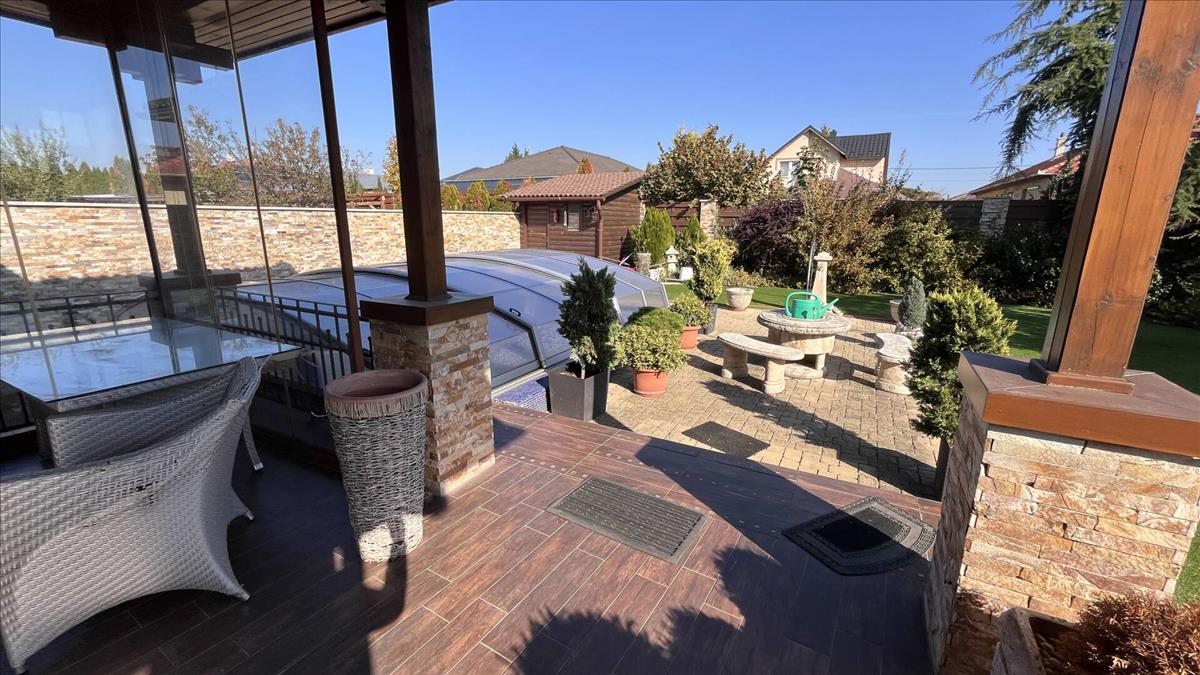 A házhoz tartozik egy gyönyörűen gondozott, 711 m²-es udvar, amelyet díszes növények ékesítenek, így a zöld környezet nyugalmát élvezheti nap mint nap. Az udvar műfűvel borított, öntözőrendszerrel ellátott, a medencében pedig vízforgató rendszer működik.