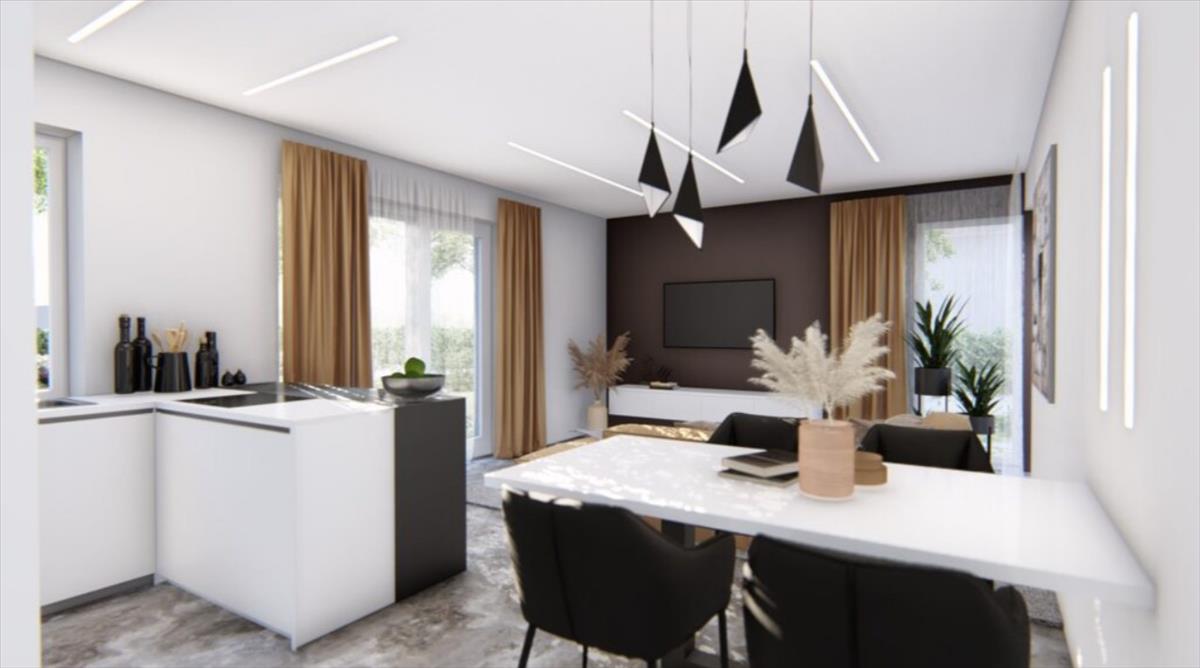 A belső elrendezés emberközpontú és praktikus. a világos nappali–étkező–konyha a családi élet központja, ahonnan közvetlen kijárat nyílik a teraszra és a kertbe. a három külön nyíló szoba lehetőséget ad pihenésre, munkára vagy gyerekszobák kialakítására – ahogy az élethelyzeted kívánja.