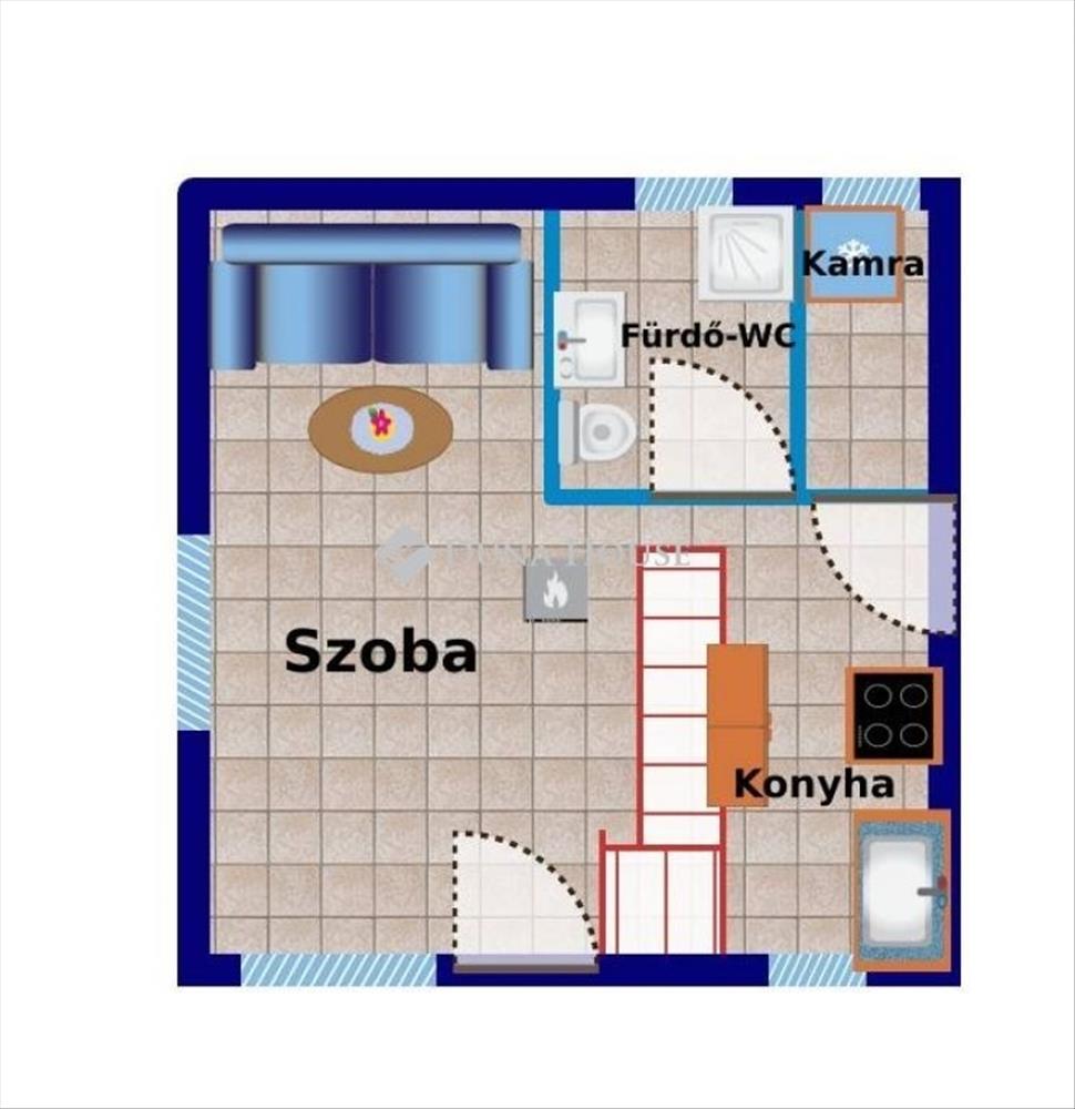 Az 1992-ben készült tervek alapján épült épület egy csendes utcáról, burkolt behajtón keresztül közelíthető meg. Az udvarról nyíló bejárati ajtón néhány lépcsőfok megtételét követően az előtéren keresztül a nappali tartózkodásra alkalmas helyiségbe érkezünk, ahol egy légtérben található a szoba és a konyha. Innen nyílik a kamra. a földszinten került elhelyezésre egy zuhanyzóval ellátott fürdőszoba, amelyben egy wc és egy melegvizes bojler is helyet kapott.