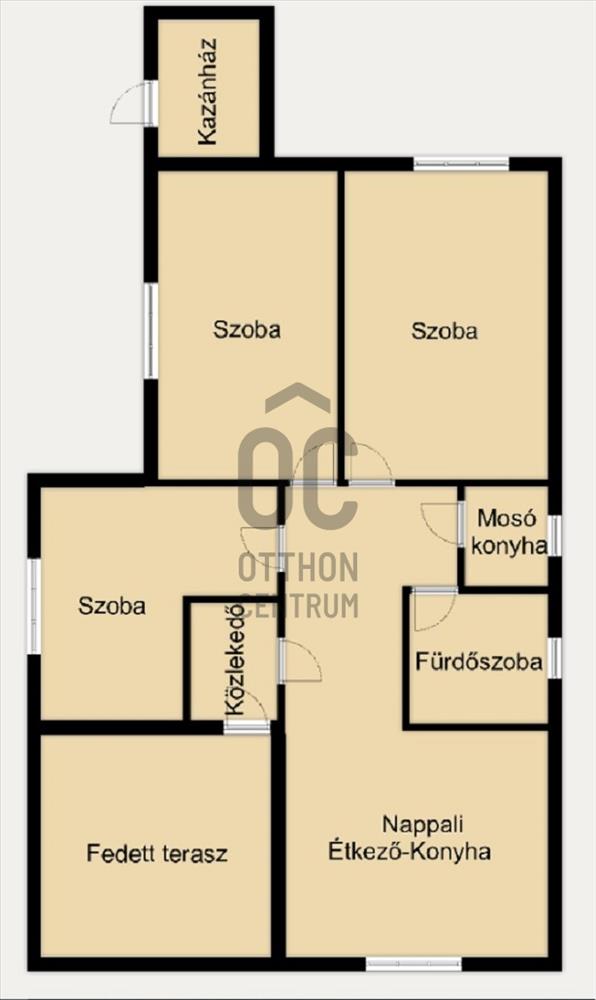 A belső elrendezése kiváló: az amerikai konyhás nappali mellett 3 külön nyíló hálószoba,