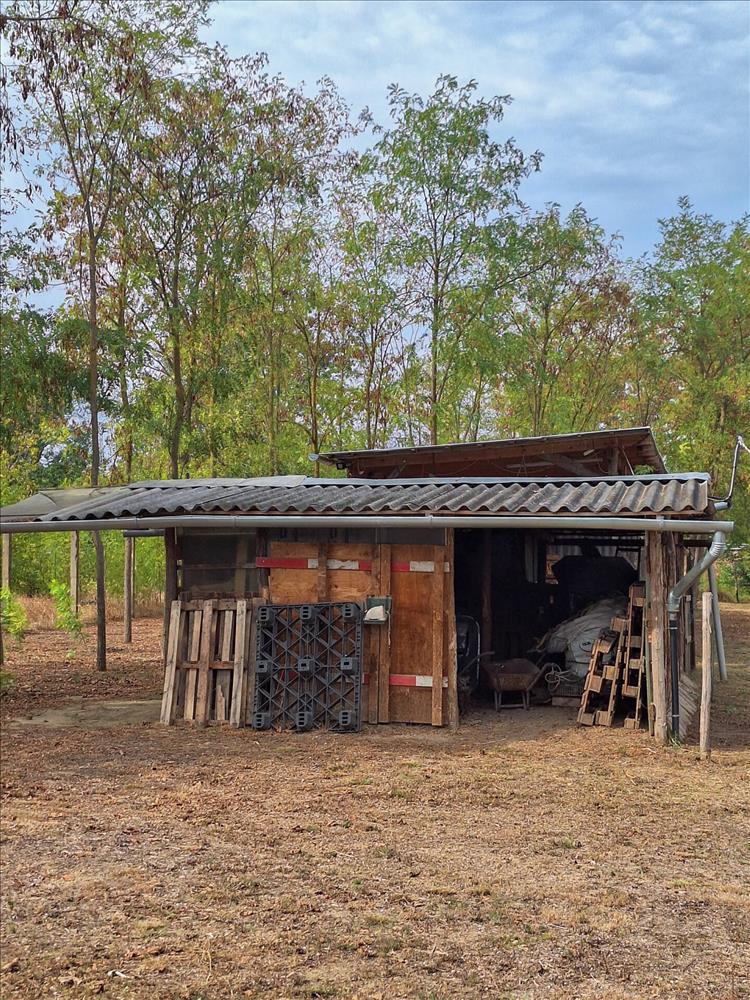 The property includes a double garage with an electric gate, as well as outbuildings, stables, and storage spaces suitable for keeping animals. At the end of the plot, an acacia grove provides firewood for heating. Comfort features include an automatic irrigation system, a security alarm and camera system, and three heating options (gas boiler, mixed fuel heating, and cooling-heating air conditioning).