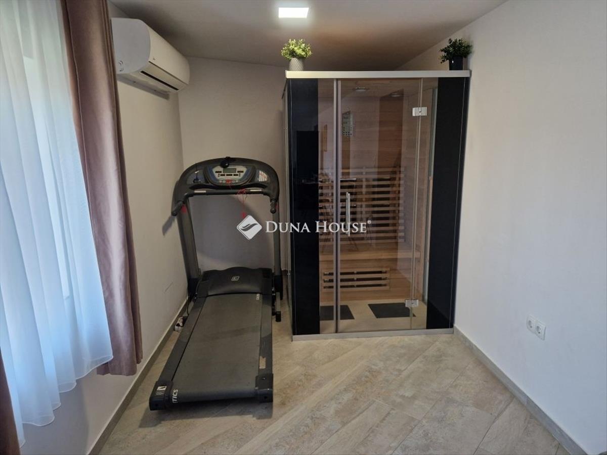 A hatalmas (51 m2) mediterrán teraszon egy 11 m2-es medence is helyet kapott, melyet korszerű hőszivattyús fűtéssel, nyak zuhannyal és 6 db masszázsfúvókával is elláttak.