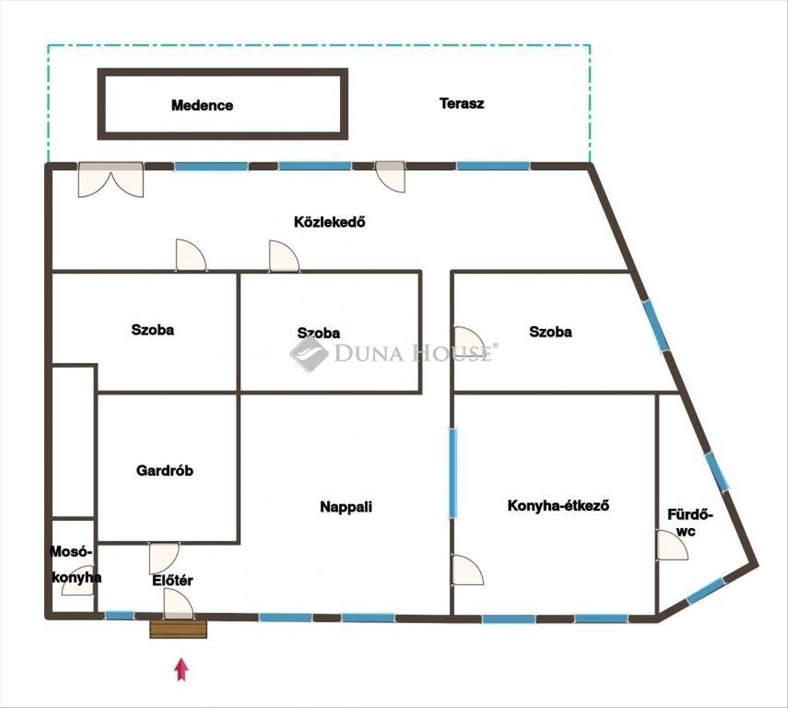 Található benne nappali, 3 hálószoba, 16 m2-es gardrób, konyha, fürdő-wc, mosókonyha és egy tágas előtér.