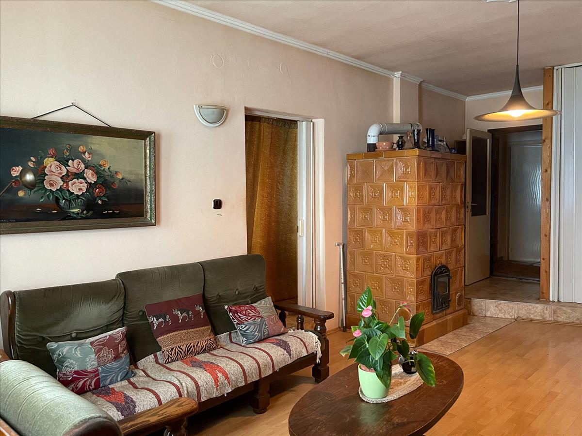 The main building is two-storey; on the ground floor there is a spacious garage with street access. On the ground floor of one half of the house there is a generous living room, a kitchen with dining area and a bedroom. a tiled stove and gas convector heaters provide cozy warmth, offering an economical solution for cold winter days.
