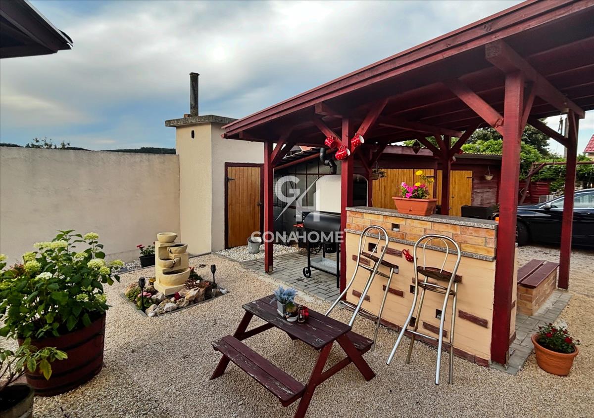 A kert praktikusan felszerelt: kialakításra került 2 kerti csap, valamint egy fúrt kút, amely vízkiemeléses szivattyúval működtethető, így az öntözés és az állattartás vízellátása költséghatékonyan megoldható. a hangulatos mini kemence és sparhelt a vidéki életérzést és az önellátó életmód lehetőségét erősíti.