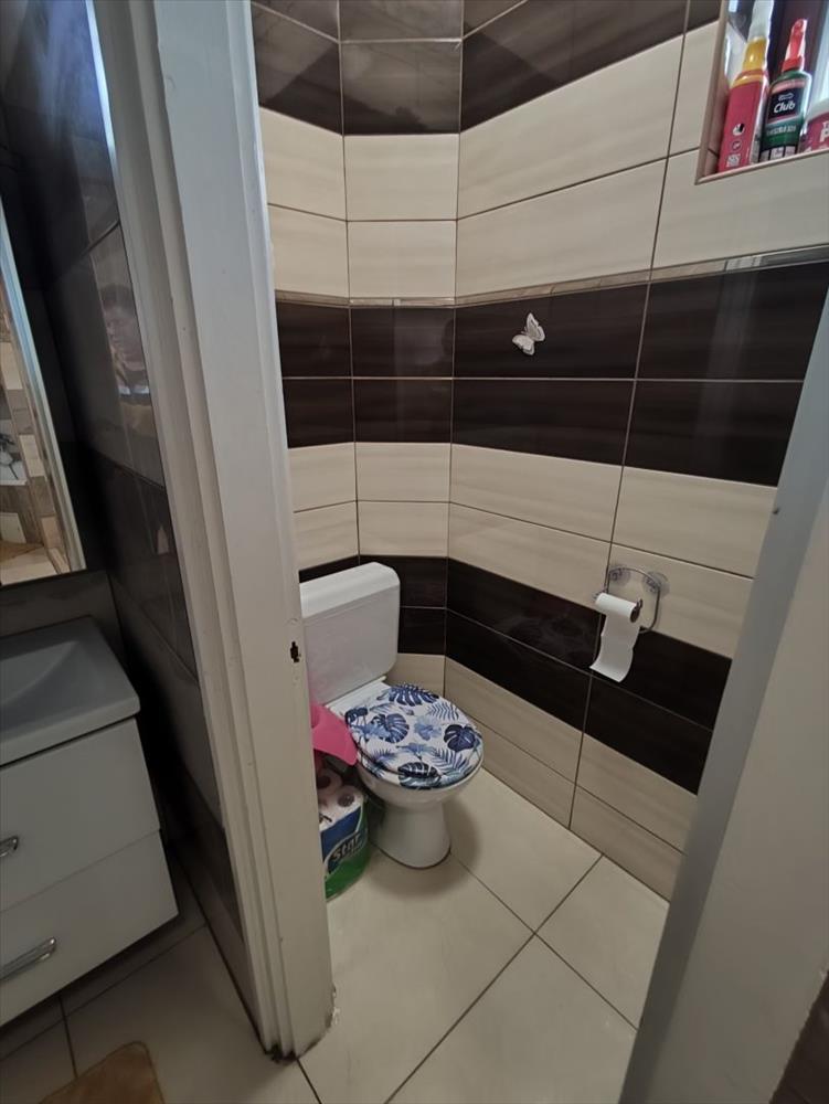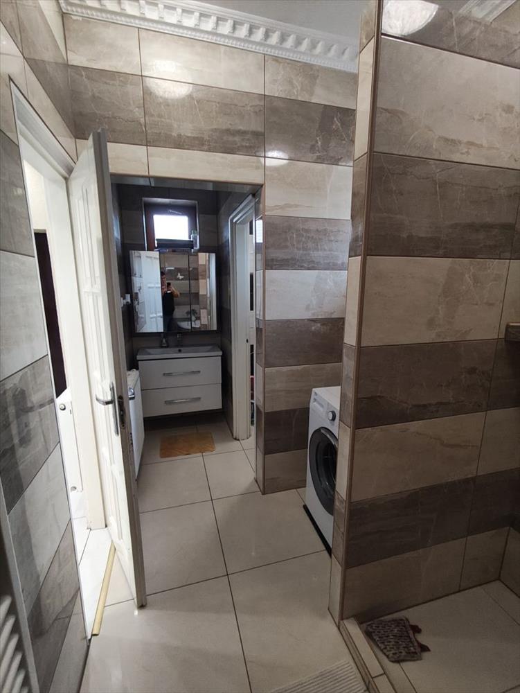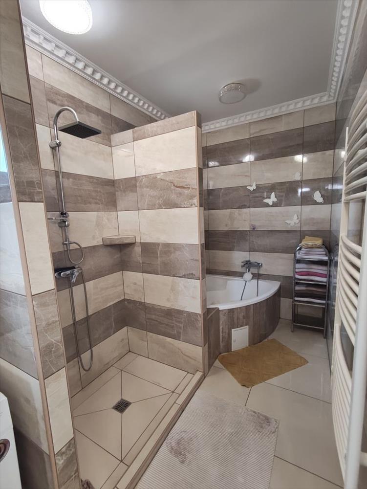 A fürdőszoba-WC burkolata új kerámia járólap a falak csempézettek új kerámia csempével találahtó benne egy új épített kád, wc, új sarokád, kézmosó.