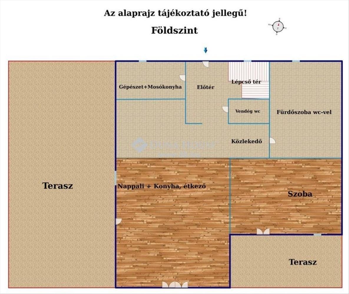 A földszinten- gépészeti helység- óriás nappali konyhával terasz kapcsolattal- hálószoba terasz kapcsolattal- vendég wc- fürdőszoba wc -vel