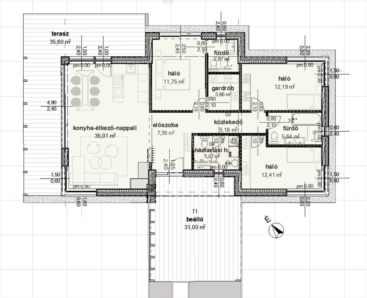 - a modern stílusú épület amerikai konyhás nappali, 3 szoba, 2 fürdőszoba, közlekedő, gardrób, valamint háztartási-gépészet helyiségekből áll, melyhez autóbeálló és terasz kapcsolódik.