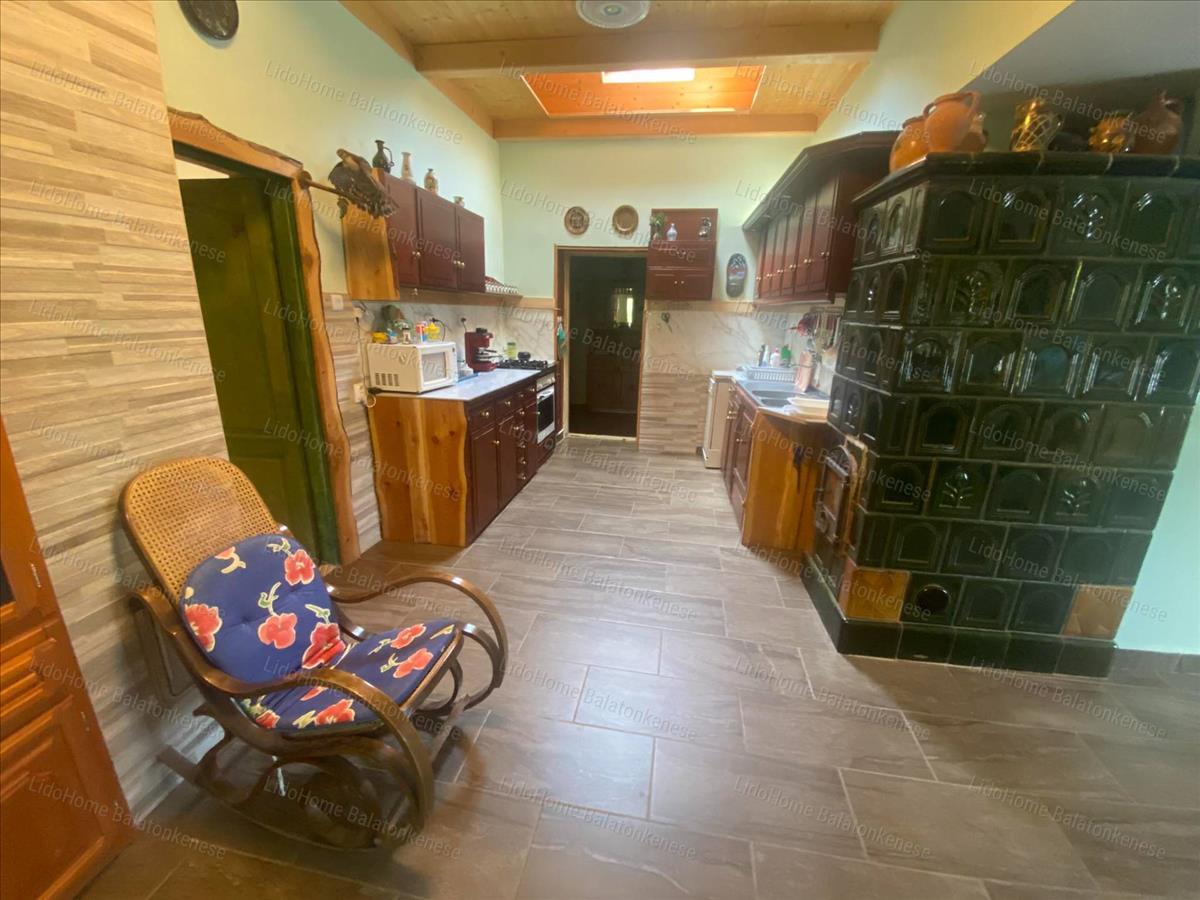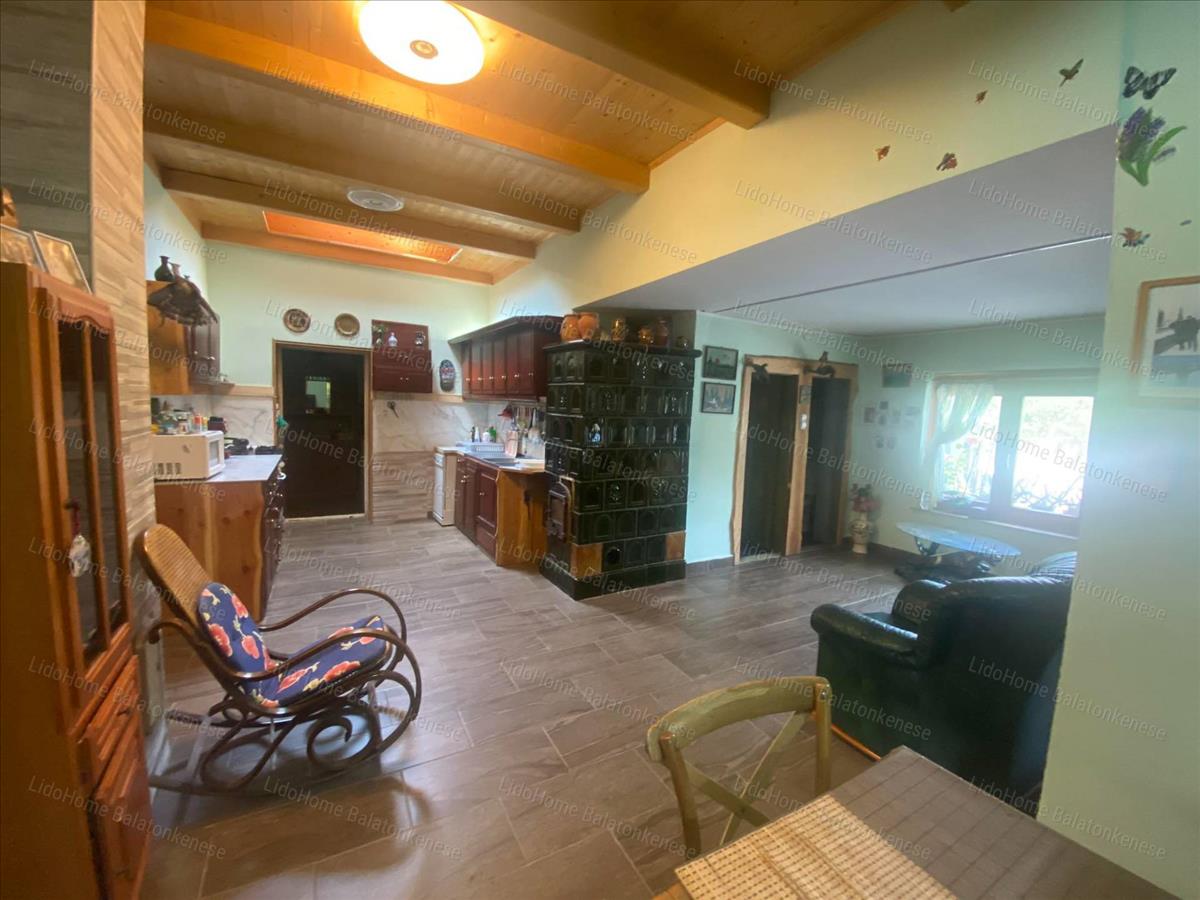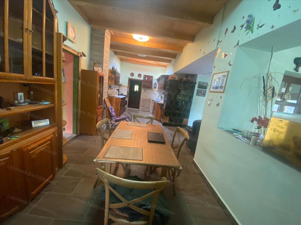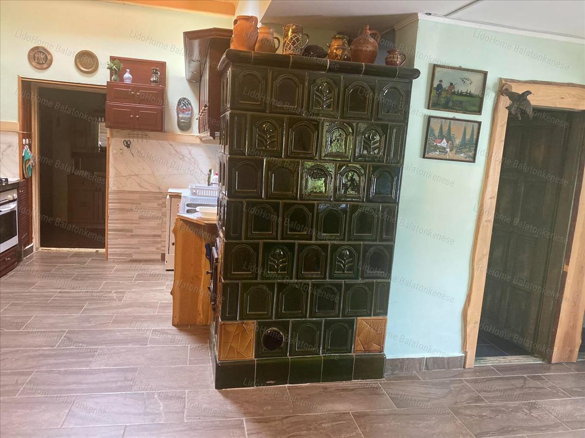Helyiségek: beépített nagy terasz, nappali-étkező-konyha, két méretes szoba, fürdőszoba, külön wc, spájz. a tetőtérben egy hatalmas szoba konyhasarokkal, egy fürdőszoba és egy balatoni panorámás terasz szolgálja a kényelmünket. a fűtést a nappaliban és a két földszinti szobában található cserépkályhák biztosítják.