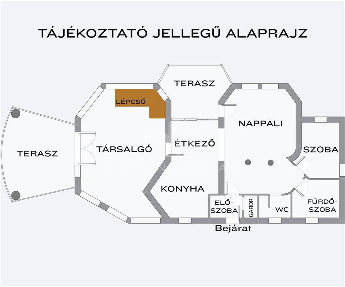 Az ingatlanban az alsó szinten a nappali-étkező-konyha kapcsolata egy egységet képez. Ezen a szinten találunk még egy teljesen elszeparált hálószobát, fürdőszobát, 2 teraszt, Wc-t és mosókonyhát, gardróbhelyiséget és egy hatalmas, nagy belmagasságú társalgót, beépített HAJÓ-BÁRPULTTAL!