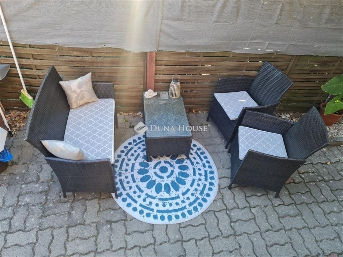 Külön belső kerítés osztja meg a telekrészt: zavartalan, fedett kerti kiülő az egyik oldalon, külön bejárat az üzlethelyiséghez a másikon