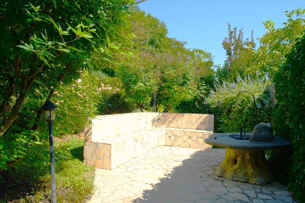 A gyönyörűen parkosított, öntözőrendszerrel ellátott telken térkövekkel díszített sütögető rész található, illetve a 3 férőhelyes garázs mellett még 4 felszíni autóbeálló.