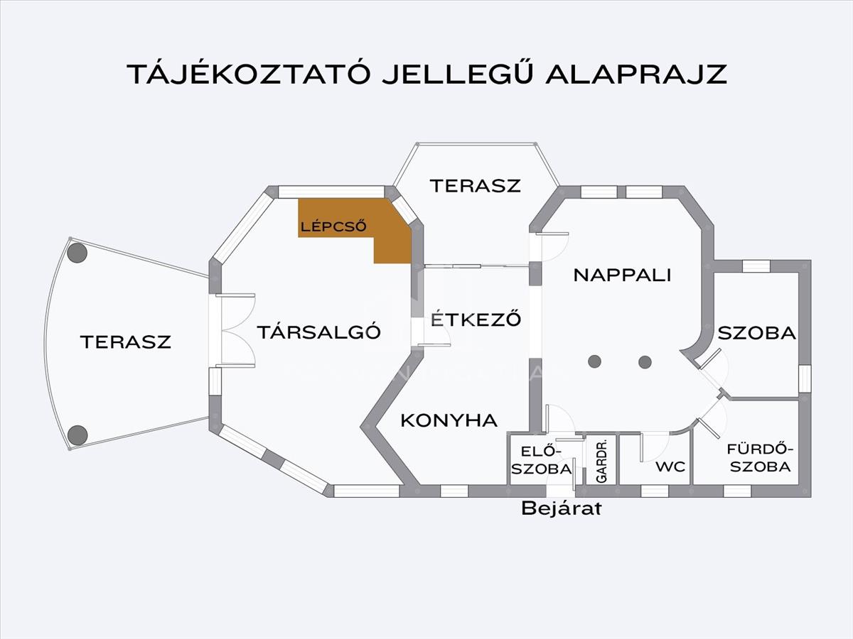 Az ingatlanban az alsó szinten a nappali-étkező-konyha kapcsolata egy egységet képez. Ezen a szinten találunk még egy teljesen elszeparált hálószobát, fürdőszobát, 2 teraszt, Wc-t és mosókonyhát, gardróbhelyiséget és egy hatalmas, nagy belmagasságú társalgót, beépített HAJÓ-BÁRPULTTAL!