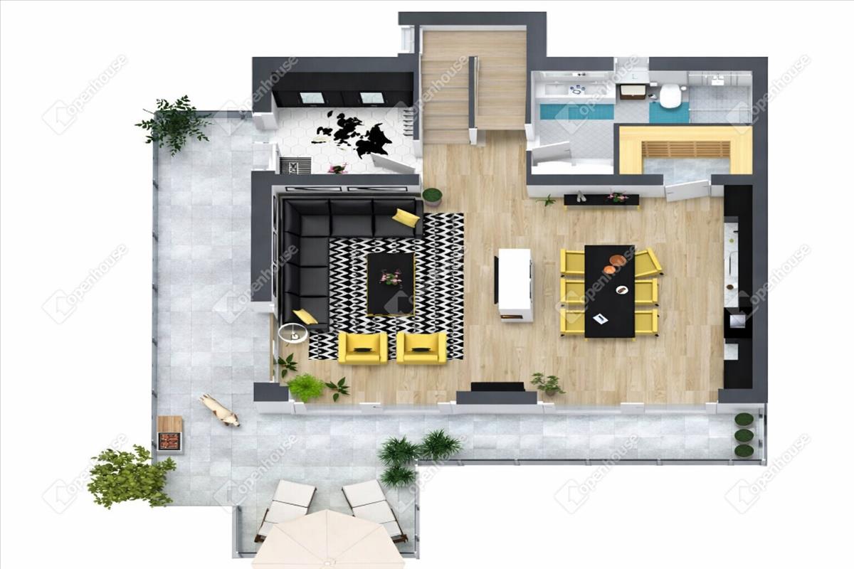 Tágas, világos nappali–konyha–étkező egy légtérben, közvetlen kertkapcsolattal