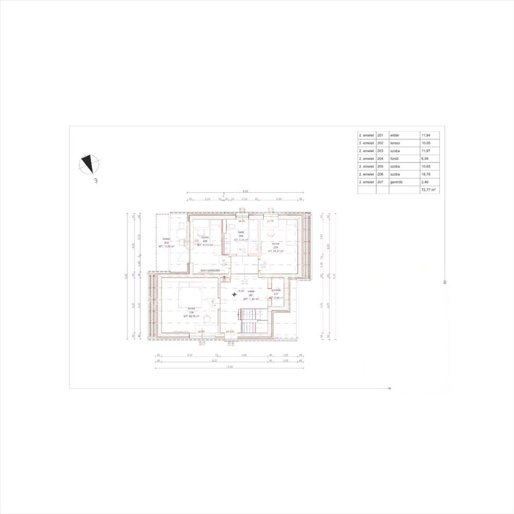 Második emelet (66, 18 m²): előtér, folyosó, három szoba, fürdő és gardrób.