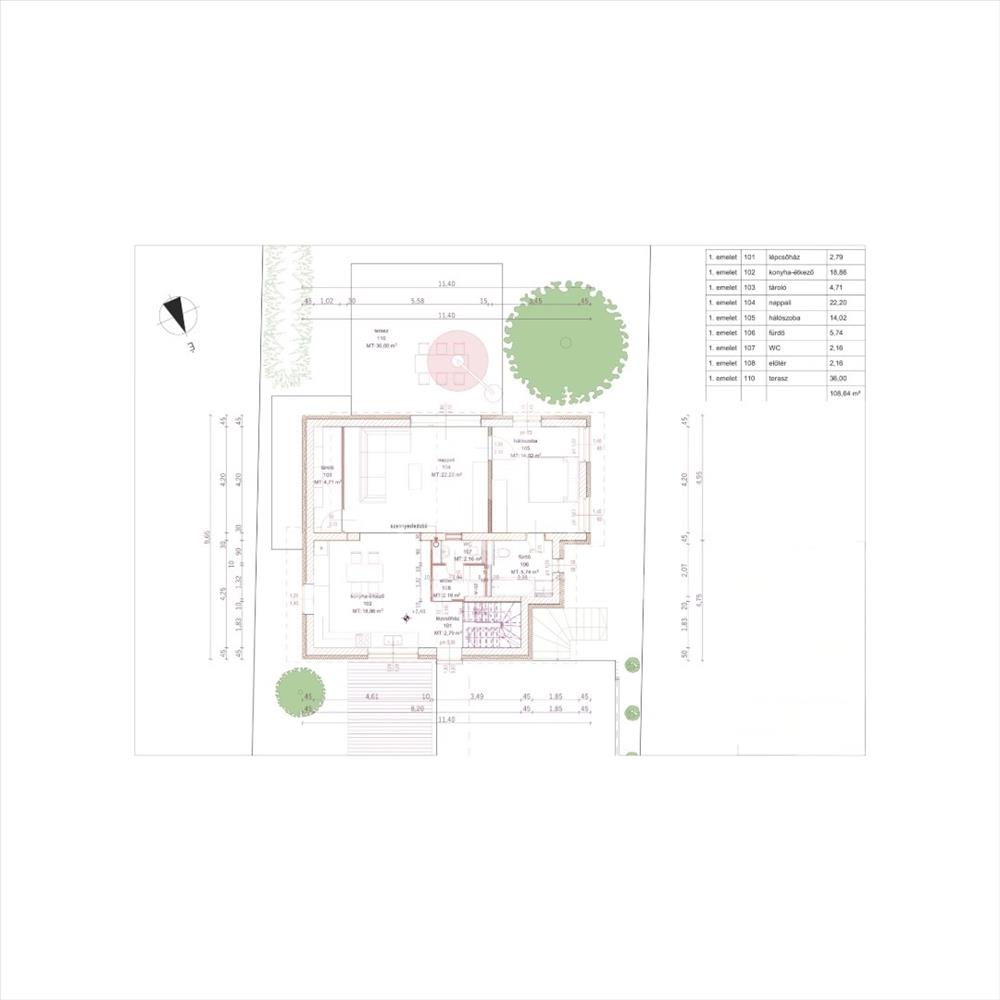 Első emelet (116, 42 m²): lépcsőház, konyha-étkező, tároló, nappali, hálószoba, fürdő, wc, előtér és terasz.