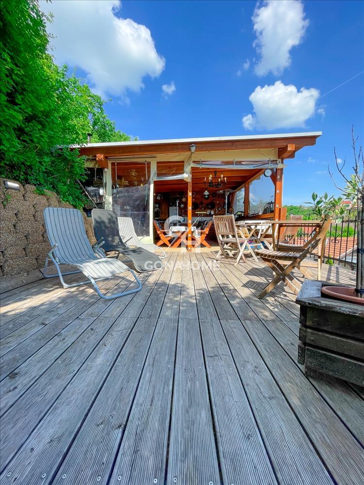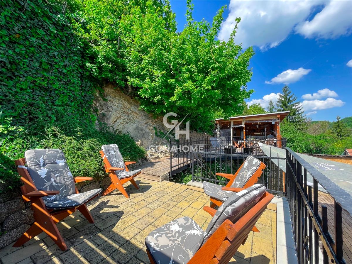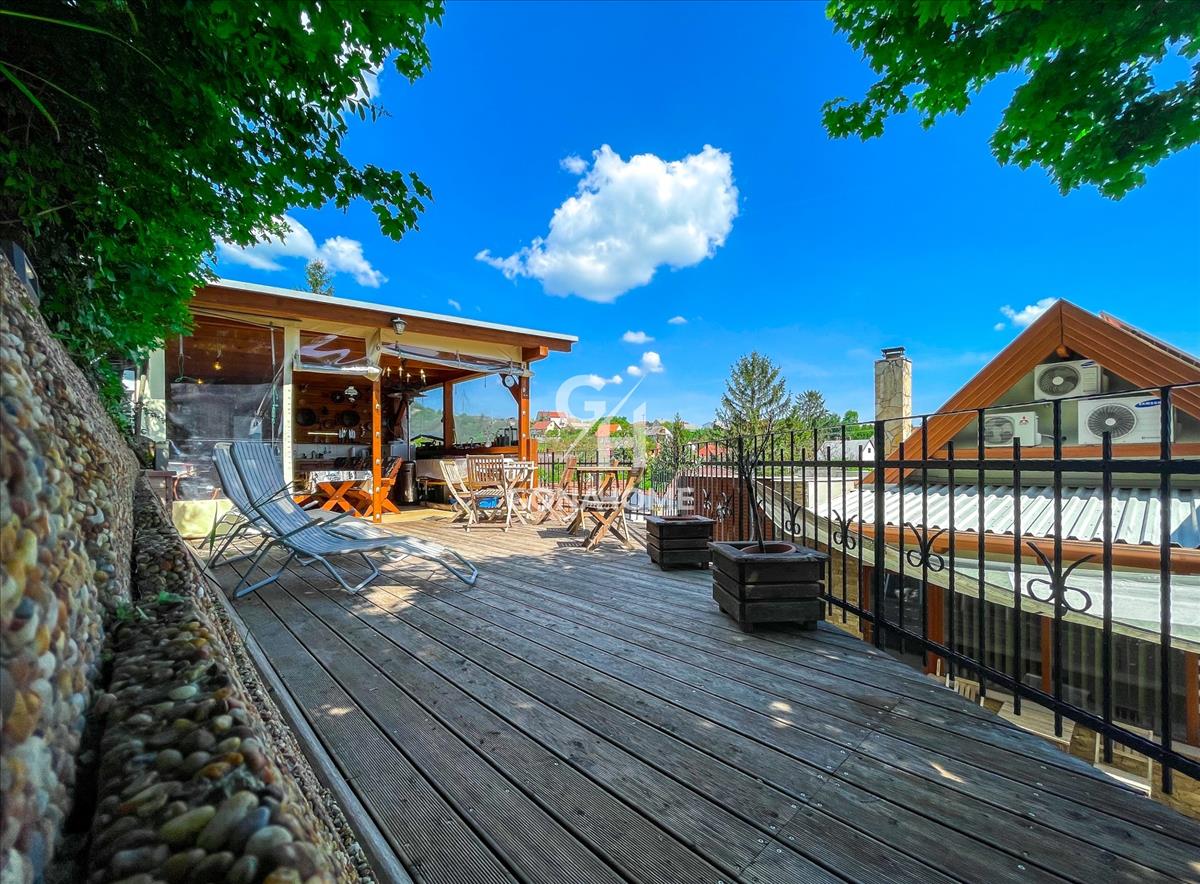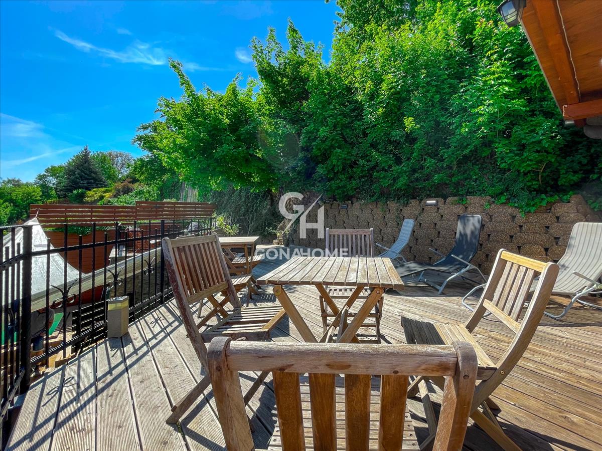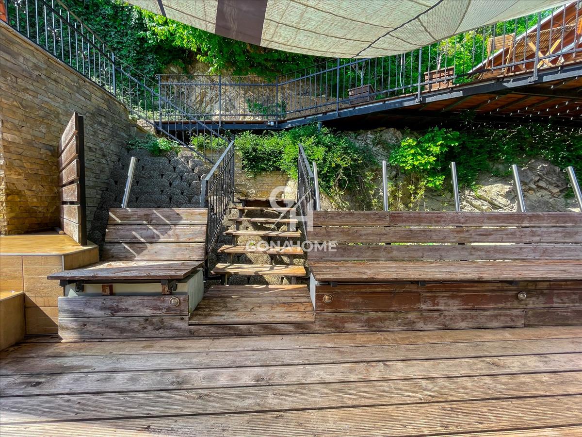A telek felső szintjén kialakításra került egy térkövezett napozó terasz, egy kb. 30 m2 vörösfenyő terasszal. Itt helyezkedik el a fedett grillterasz, ami kb. 50 m2 és külön WC-vel, mosogatóval, konyhapulttal és kemencével rendelkezik.