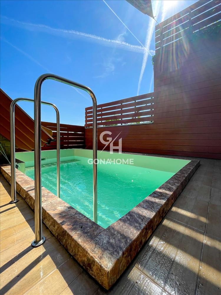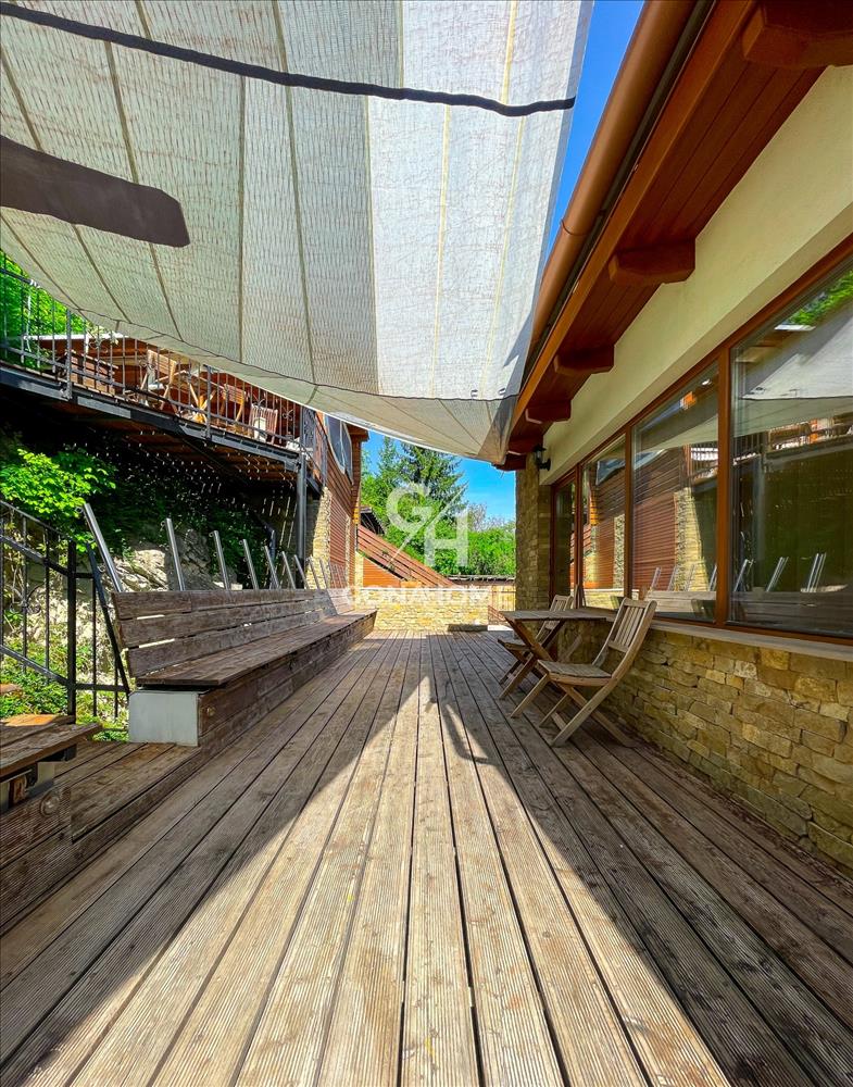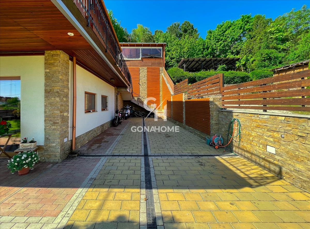 A ház körül vörösfenyő burkolatú teraszok vannak a ház teljesen körbejárható, ahova minden helységből ki lehet jutni. Itt található a medence, külön szinten a grillterasz. Alsó szinten kertkapcsolatos nappali, elhúzható tolóajtókkal.